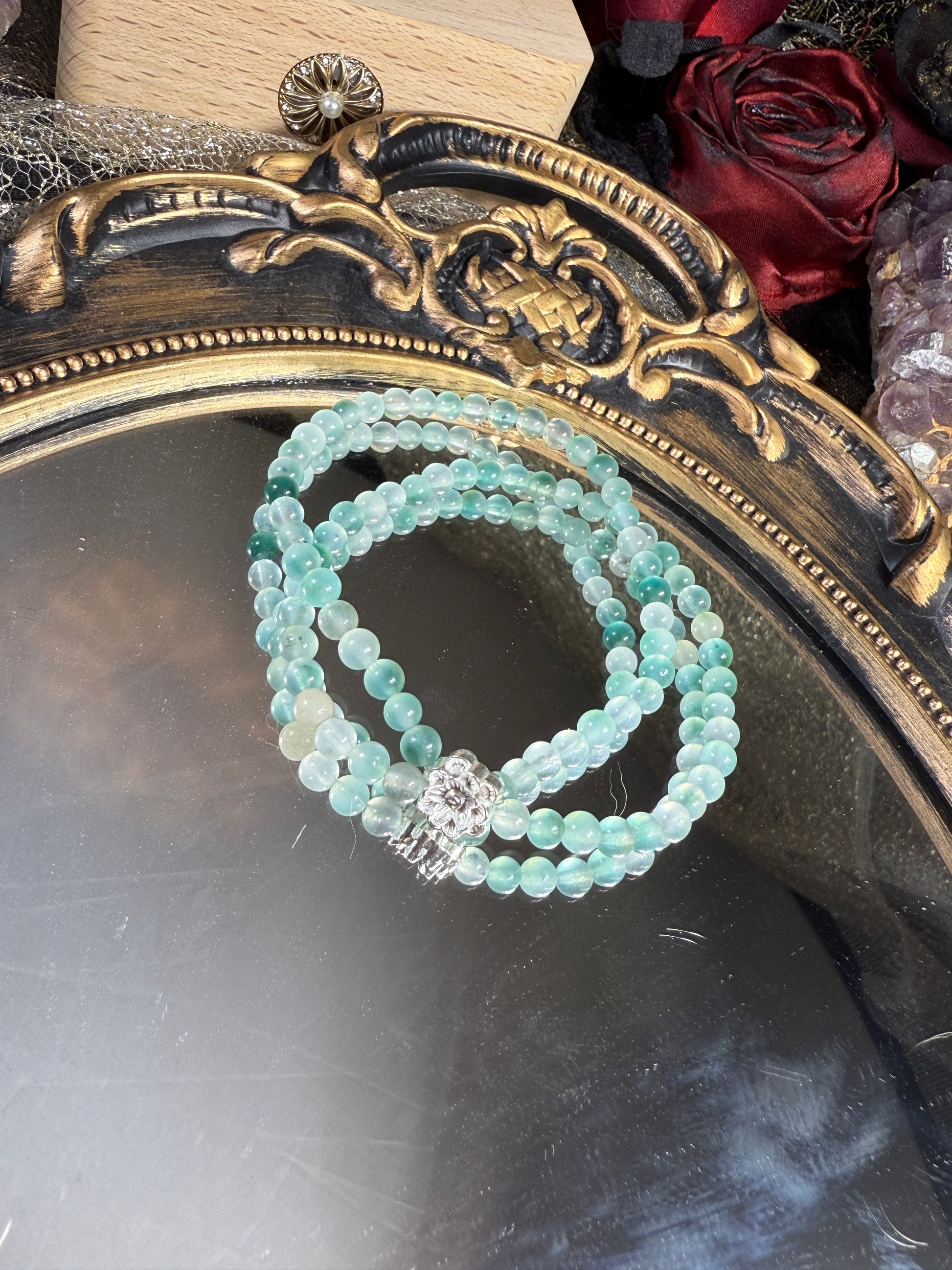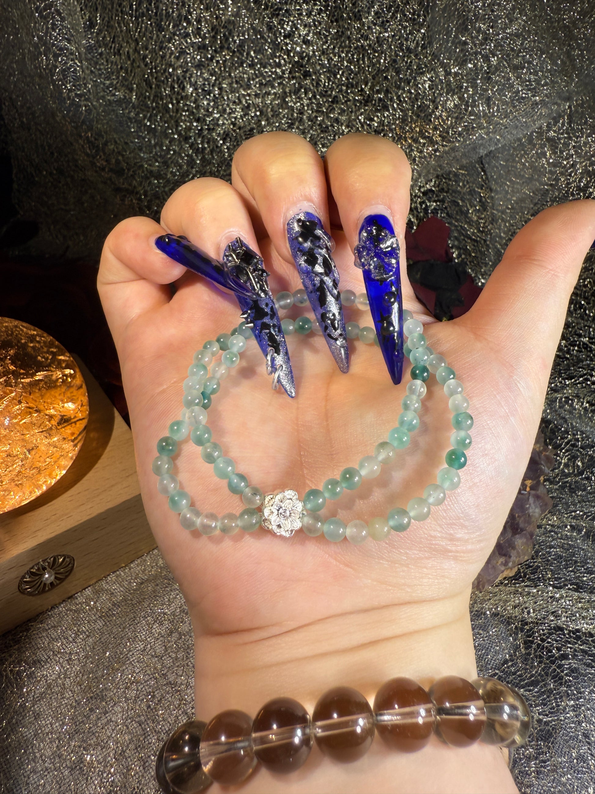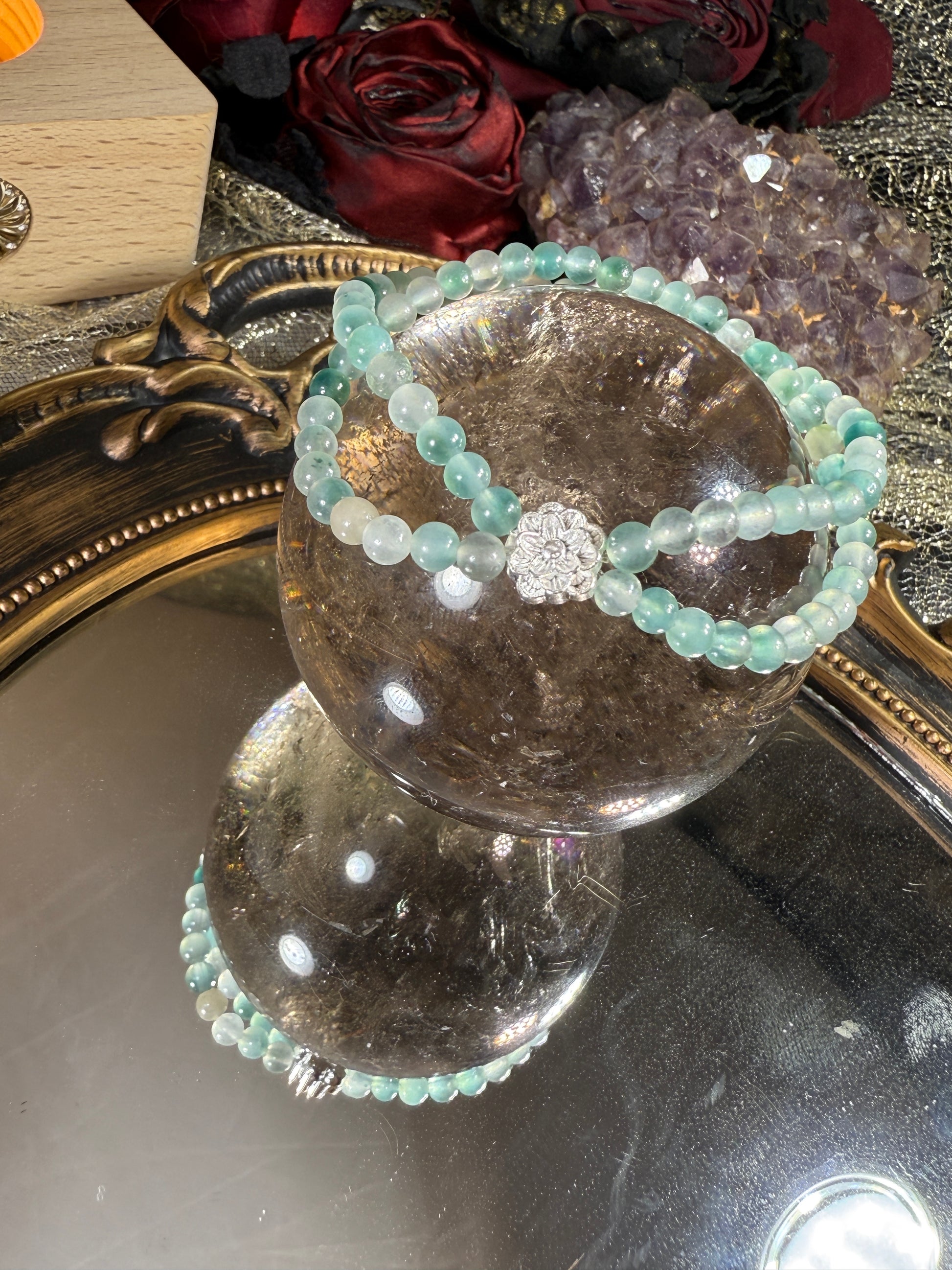 Meadowlight – a serene dance of translucent green chalcedony, glowing like dew-kissed grass at dawn. This piece embodies nature’s quiet elegance, offering a refreshing touch to your daily adornment. Hand-strung with care, it’s a gentle reminder of renewal, peace, and the grounding presence of the earth