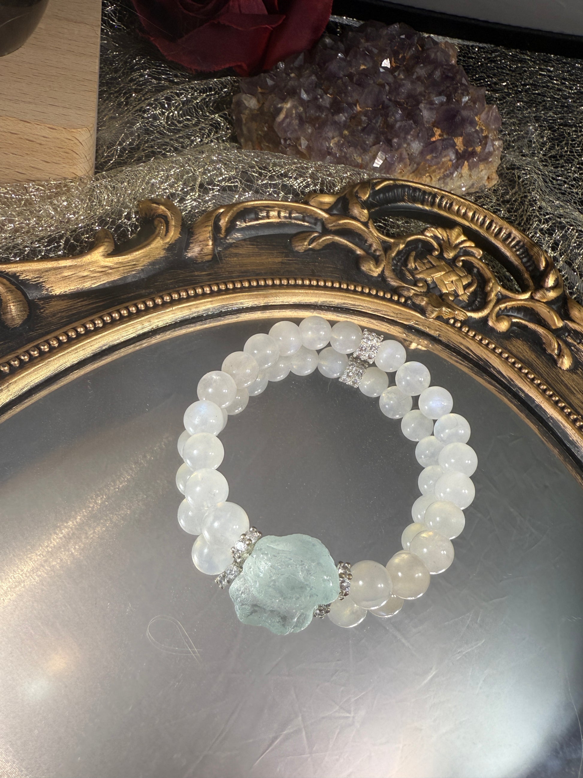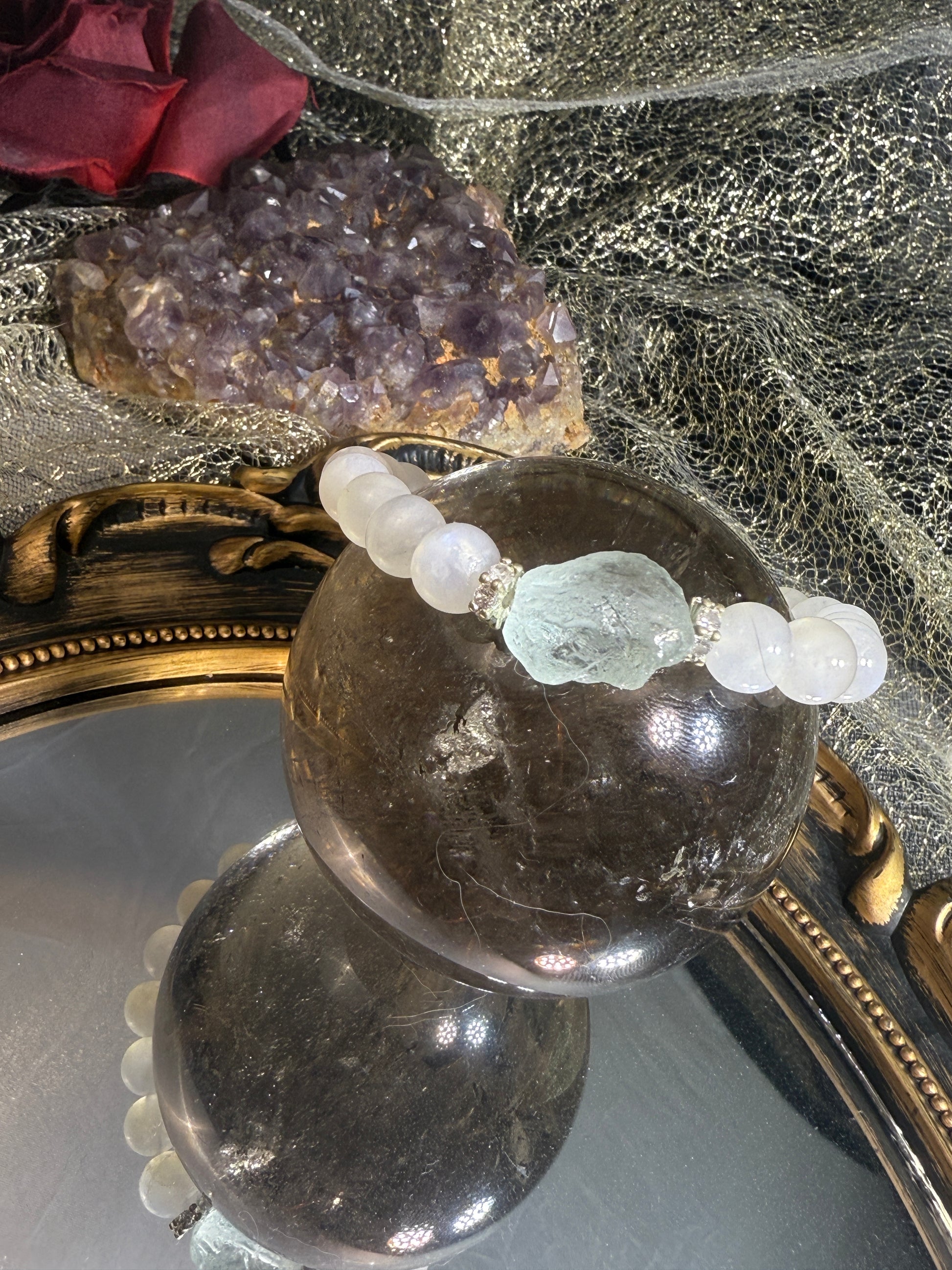 Moonlight fractured by the sea—this bracelet fuses the ethereal glow of blue moonstone with the raw softness of sea glass.