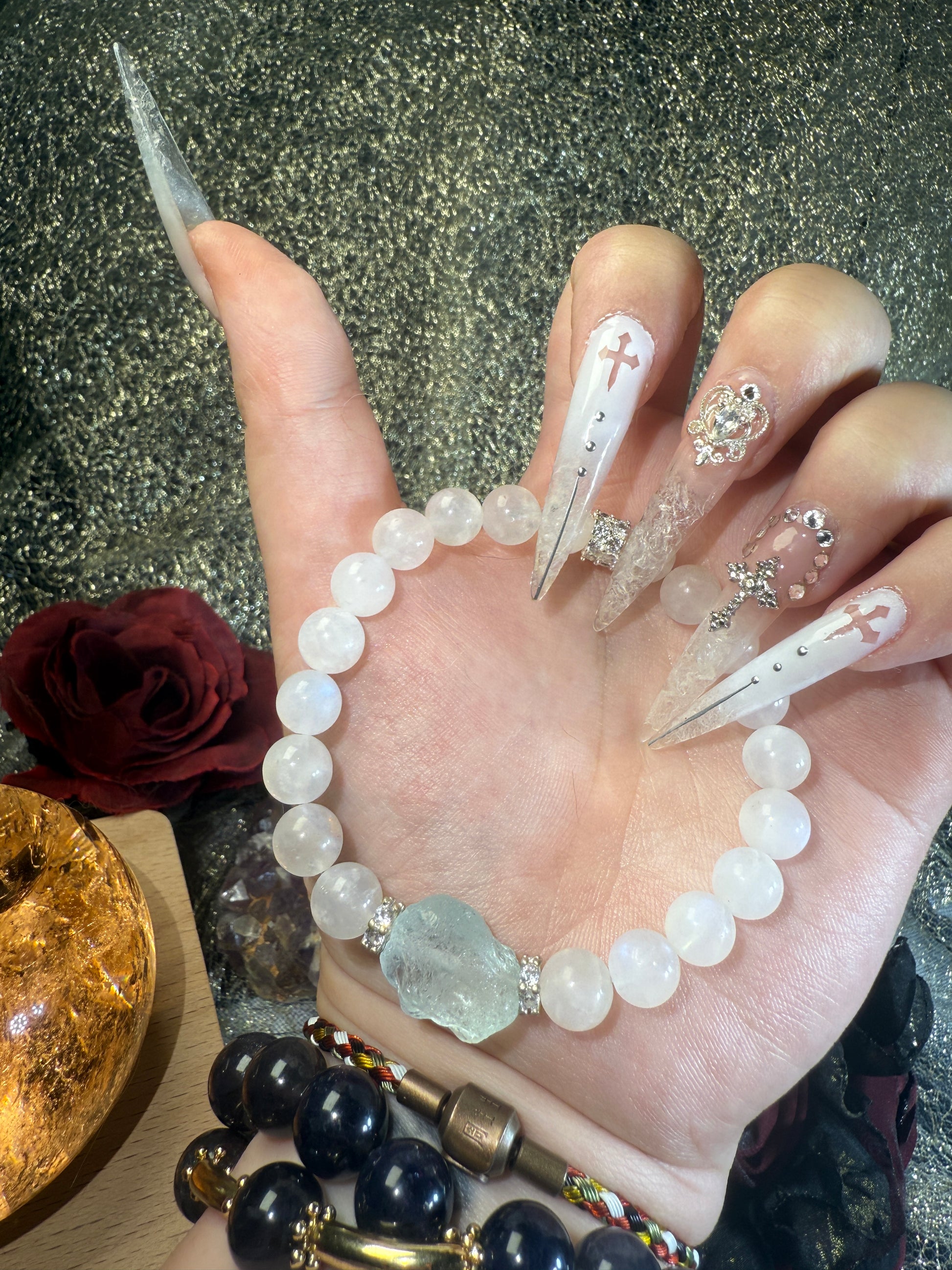 - Blue Moonstone:Stone of intuition, feminine energy, and lunar connection. It enhances emotional balance, deepens inner vision, and opens the wearer to divine guidance.