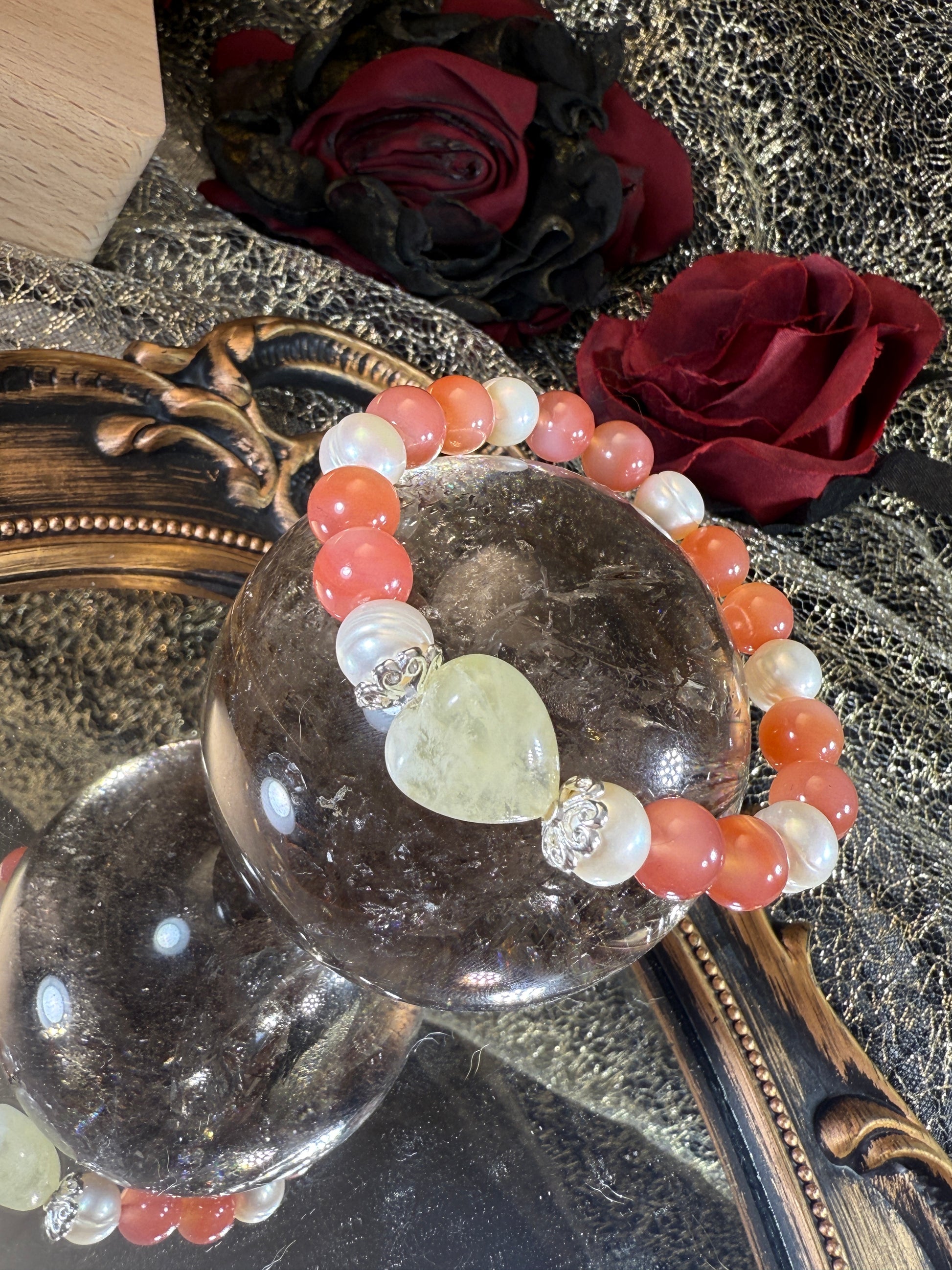 A radiant bracelet handcrafted with the softness of luminous pearls, the warmth of South Red Agate, and a central lemon quartz heart that gleams like morning sun filtered through apricot petals. Apricelle is delicate yet bold—an ode to gentle strength and glowing joy.
