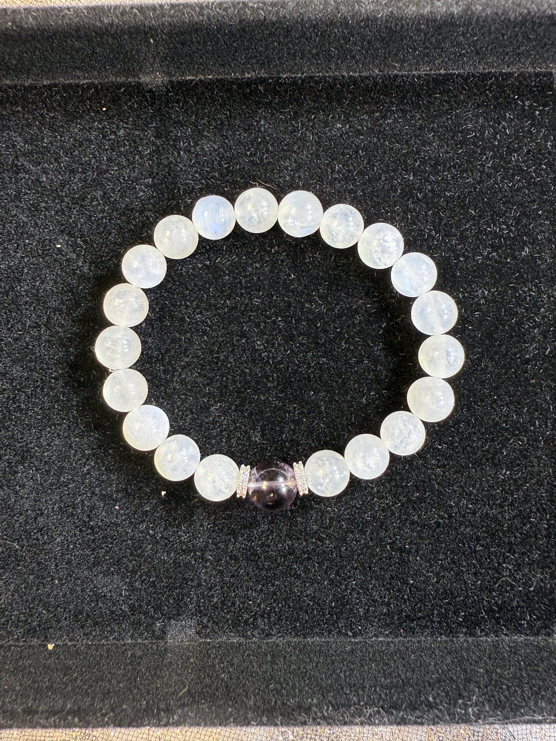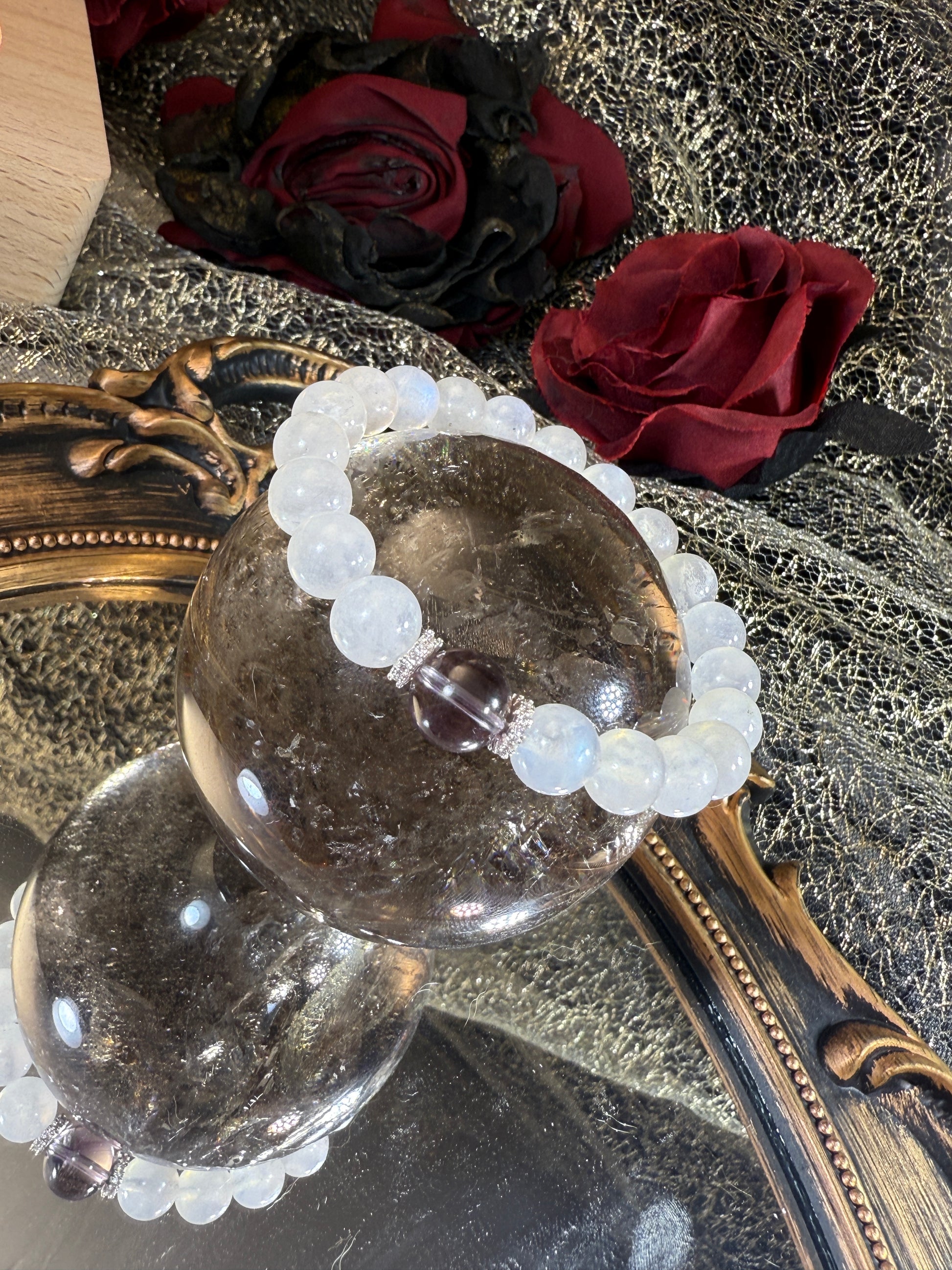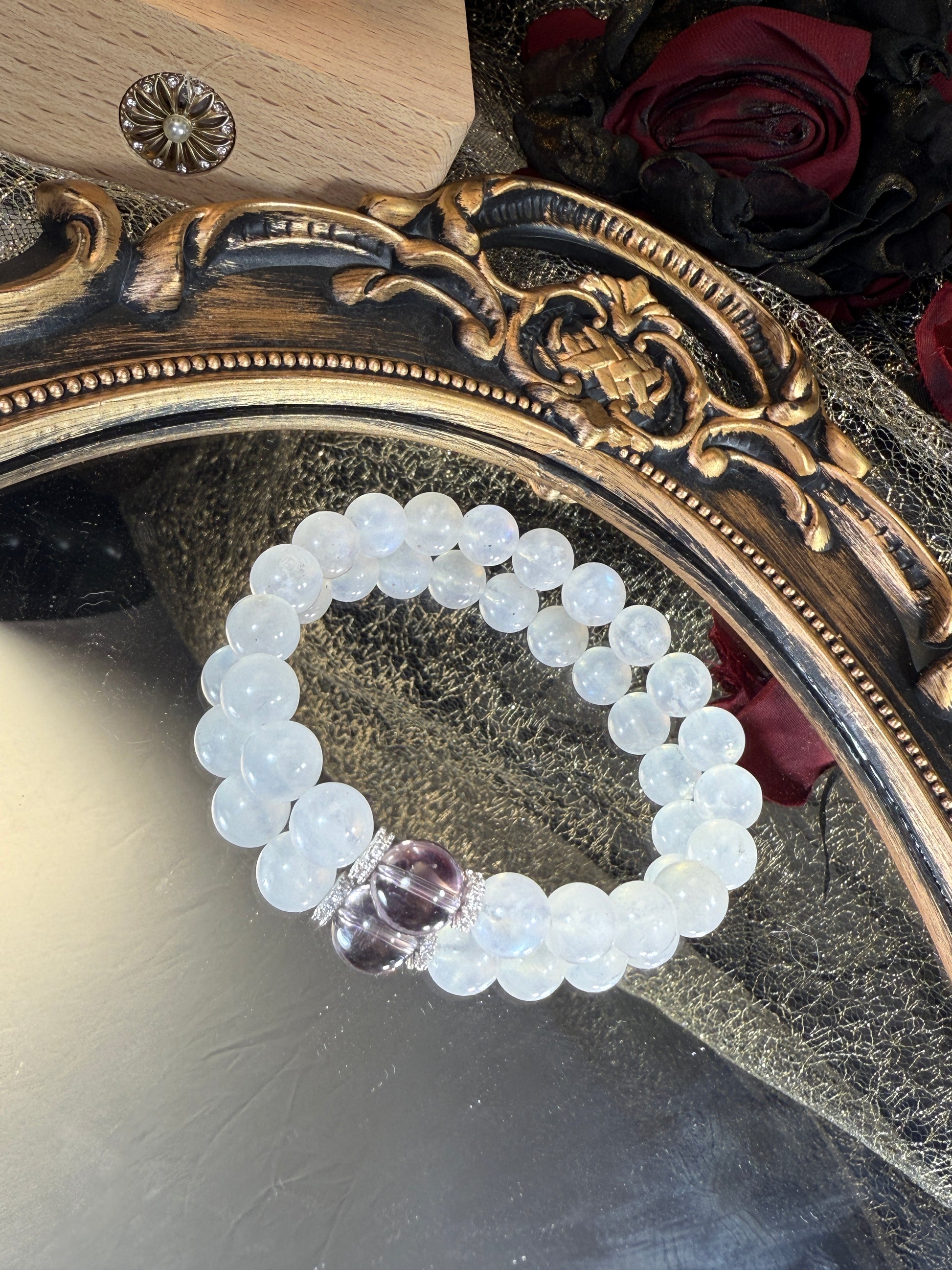 Arcane Bloom is a bracelet that captures the quiet magic of the moonlit hours. Featuring luminous blue moonstone and a single high-grade amethyst centerpiece, this design is an ode to intuitive grace and inner transformation. Its icy glow contrasts against the violet core—subtle yet striking.