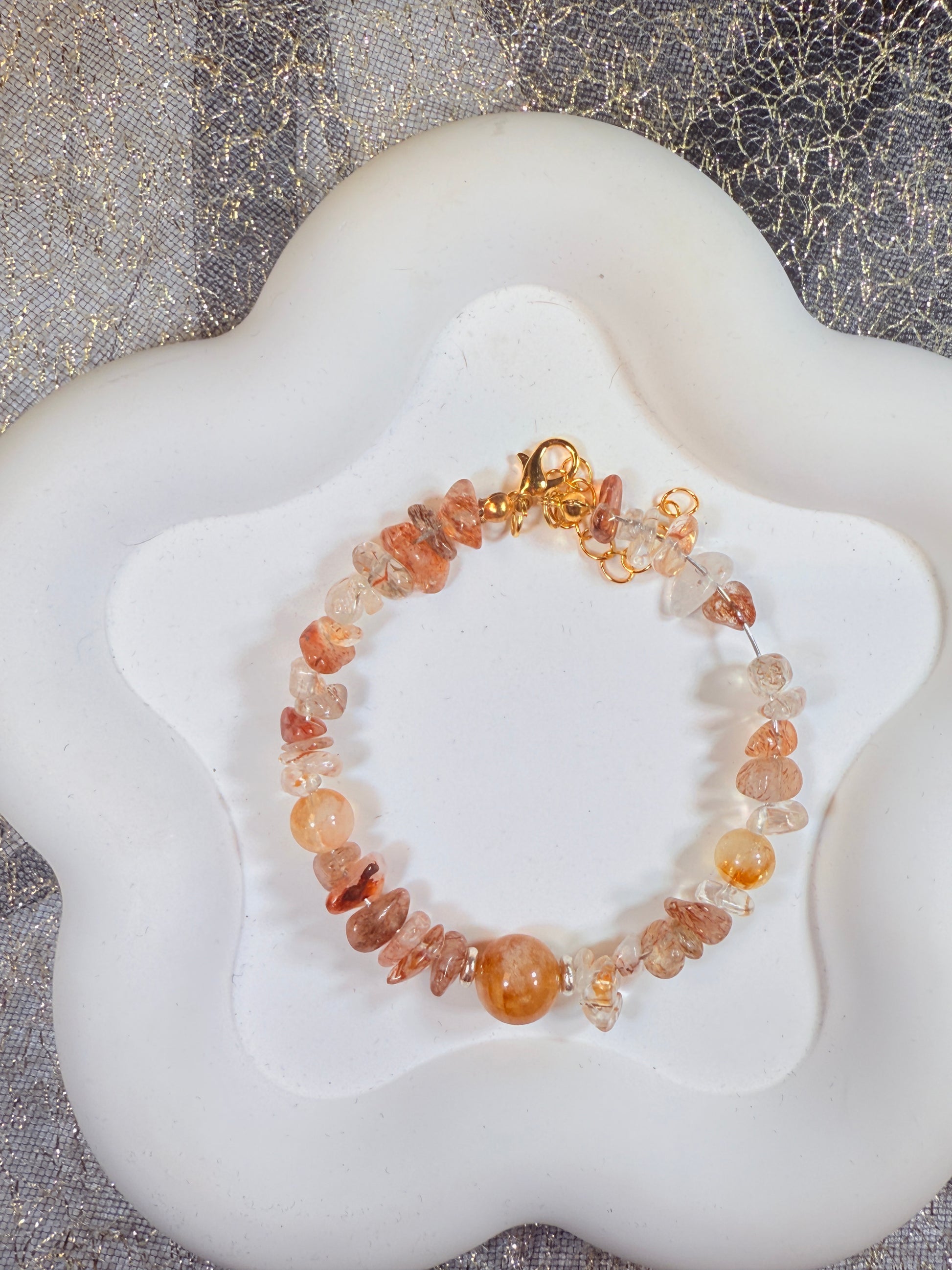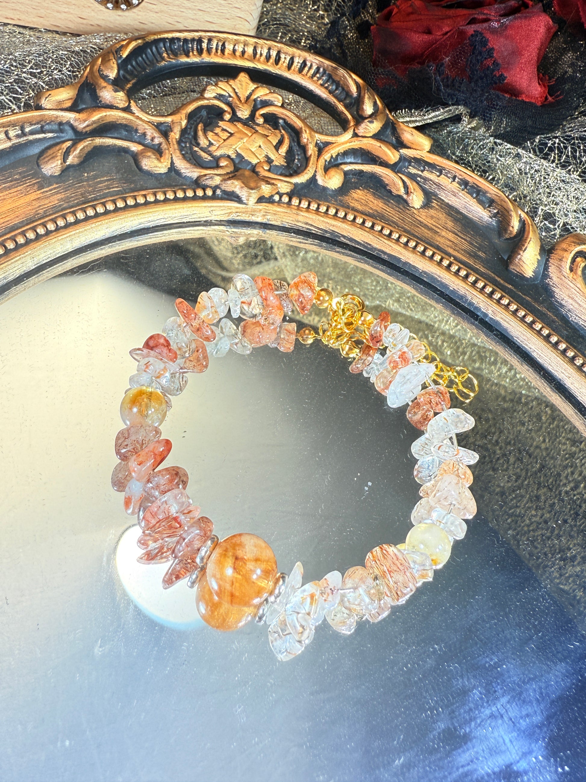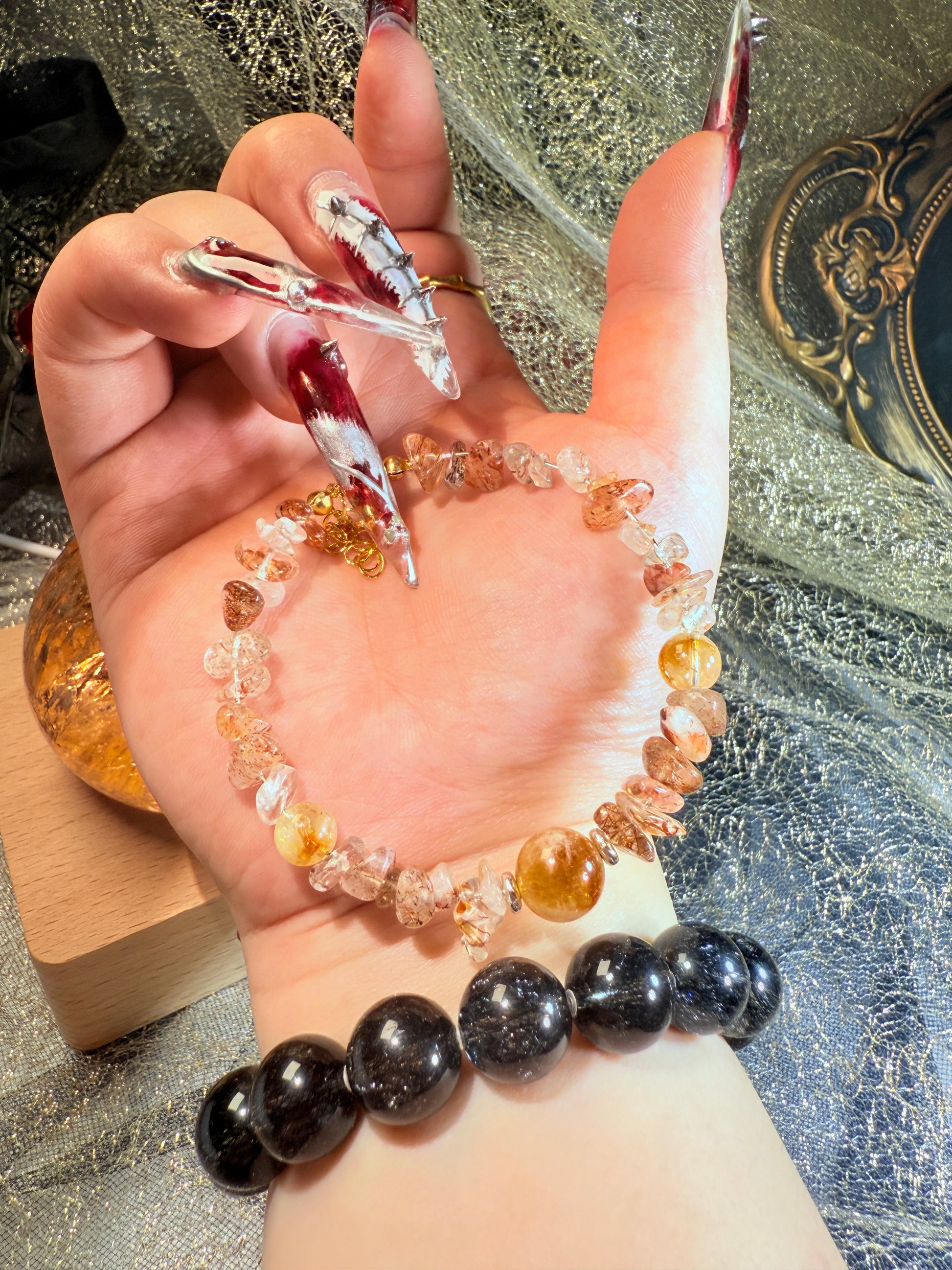 Ashen Flare is a radiant bracelet crafted from vibrant Citrine, and raw Black Gold Super Seven chips. At its heart lies a golden-yellow citrine, glowing like an ember amidst smoky twilight. The interplay of textures and colors captures the tension between shadow and flame—a flare in the ash.