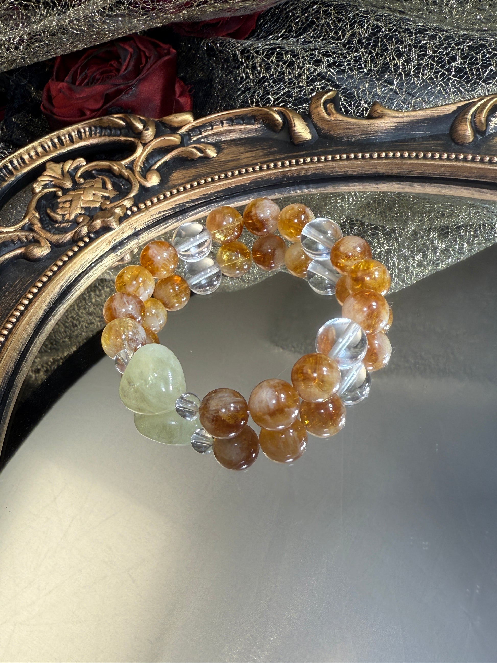 Auric Wish is a radiant blend of golden milky citrine, clear quartz, and a lemon quartz heart centerpiece — a talisman for clarity, abundance, and light-filled wishes. Its sunny core and luminous beads evoke a sense of quiet optimism, like a golden whisper woven into your aura.