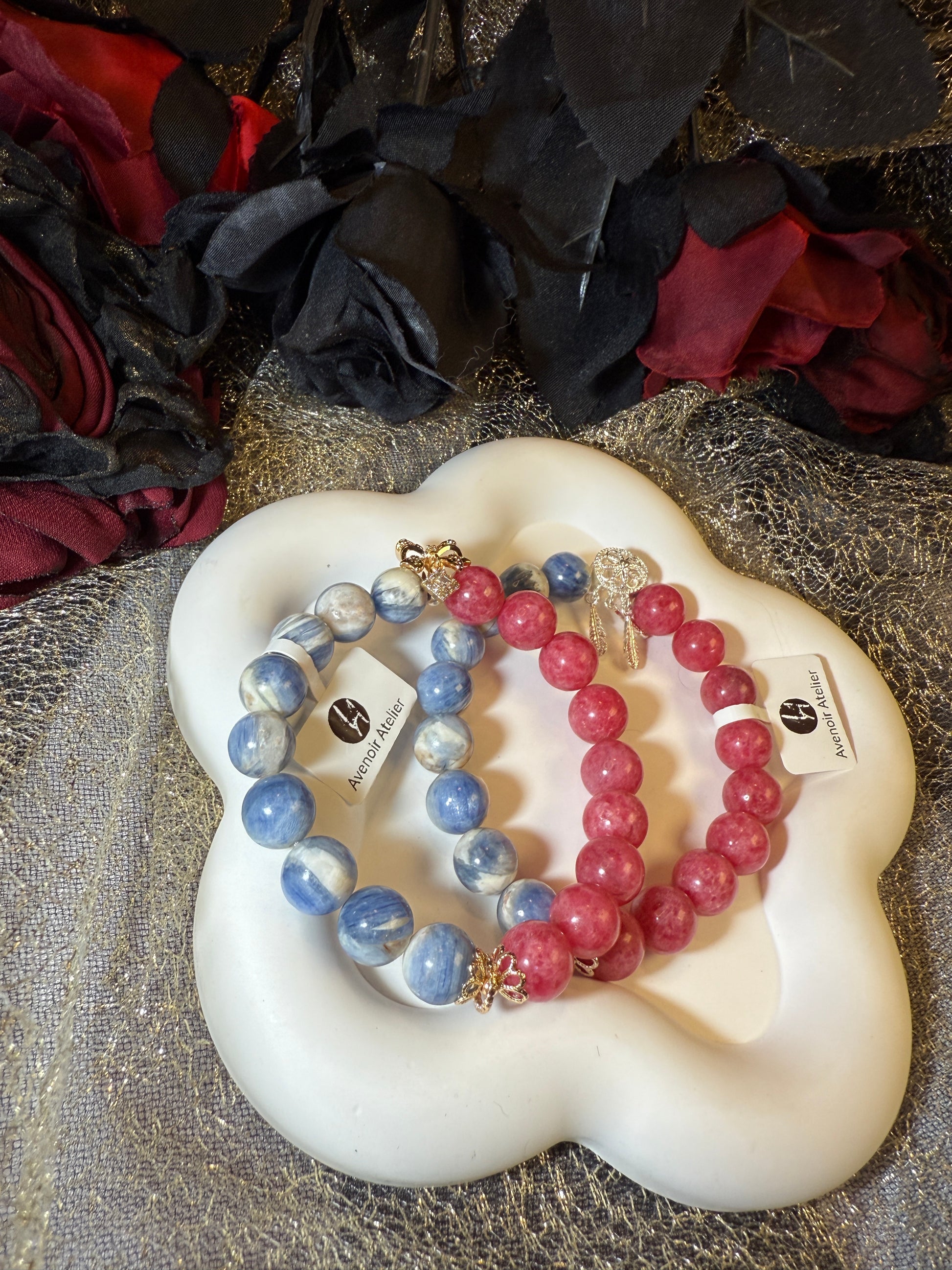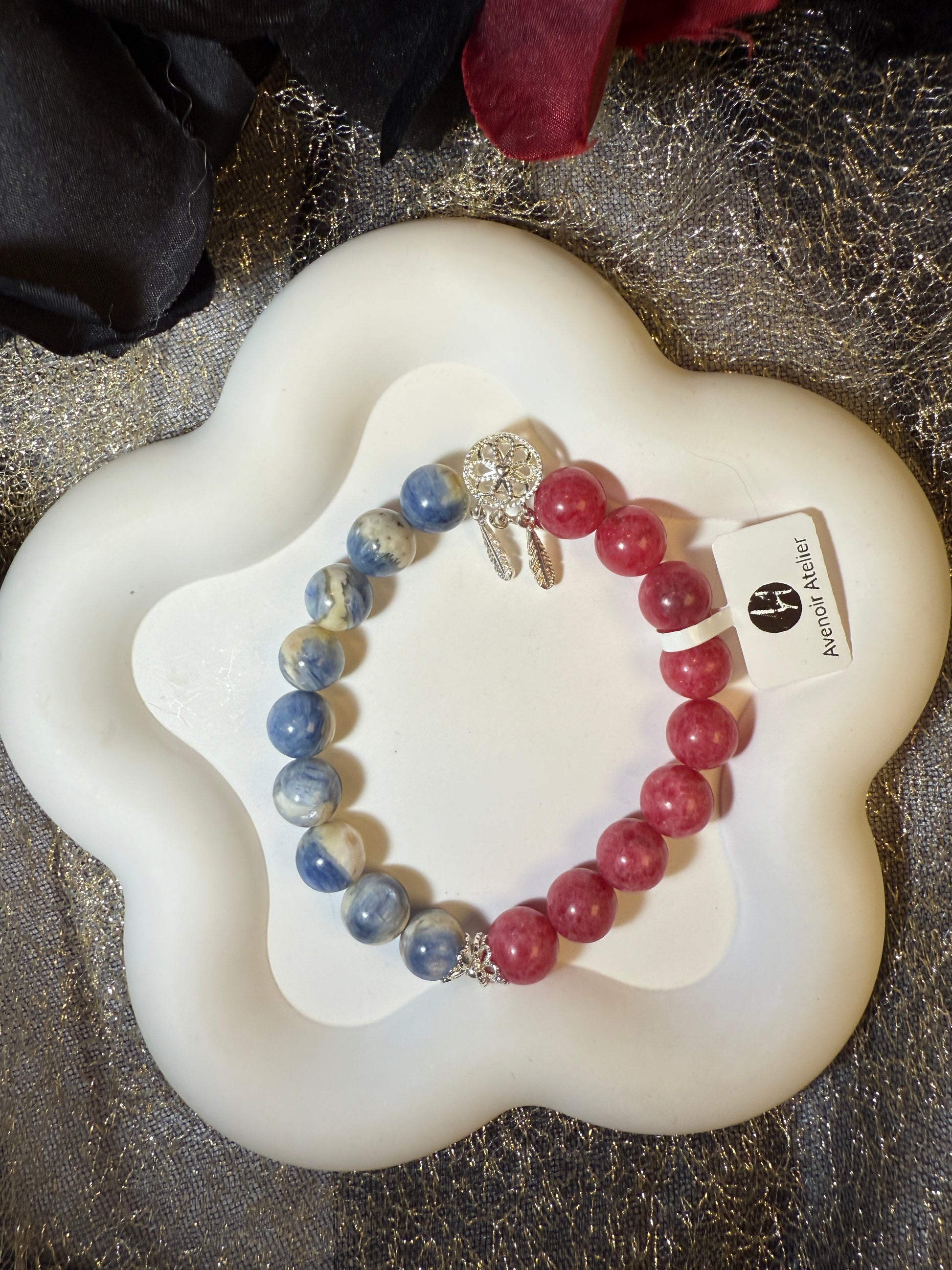 Eclipse Veil is a dance of opposites—where dusk meets dawn, softness meets resolve. This dual-tone bracelet pairs the warm, glowing energy of rose lithium feldspar with the cool, serene presence of blue kyanite. Like an eclipse casting its veil across the sky, this piece speaks of inner balance, emotional integration, and quiet transformation. Finished with a silver accent, it's a talisman for those seeking harmony between heart and mind.