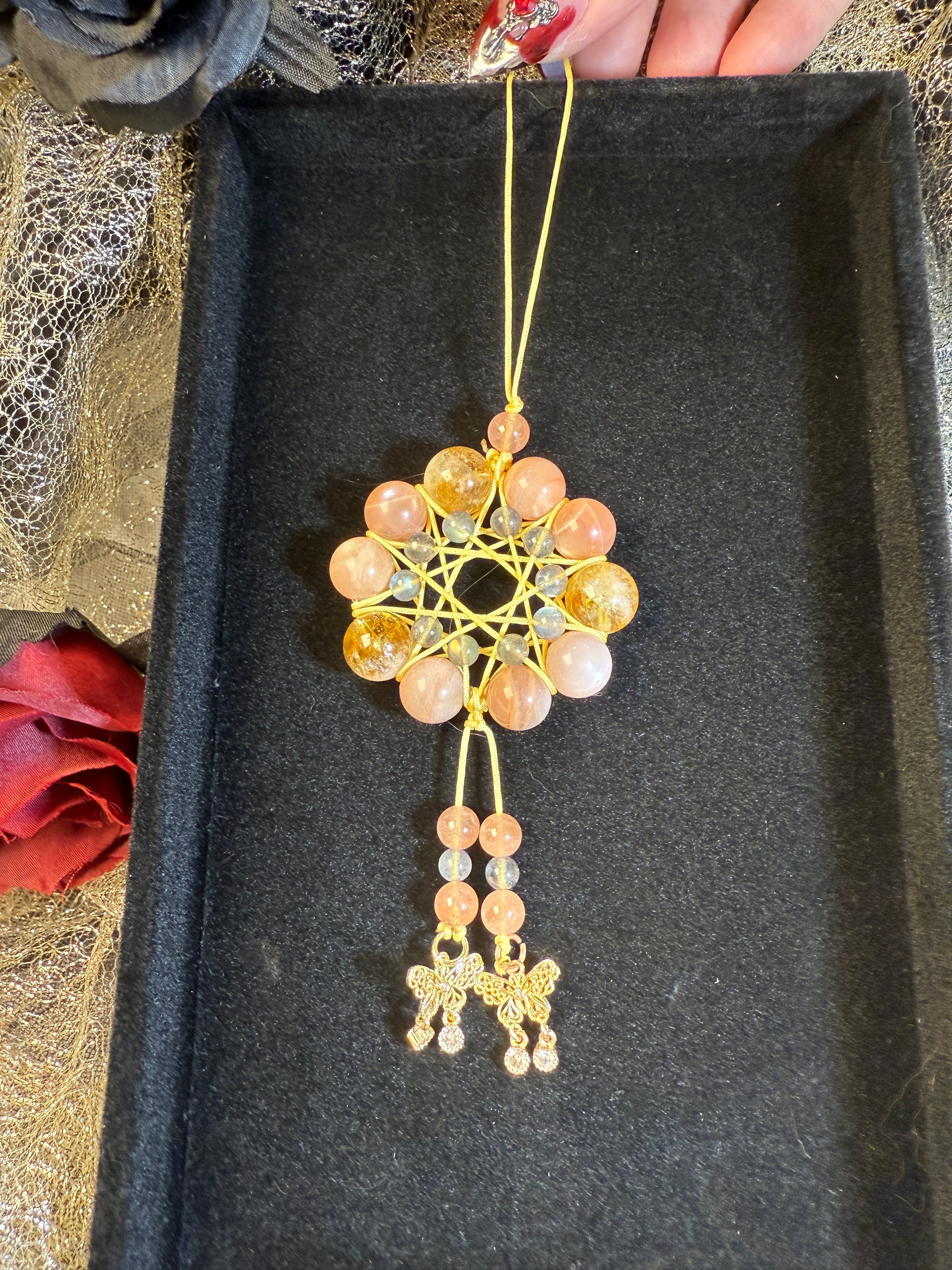 Daybreak Whisper is a golden-threaded dream talisman crafted with orange moonstone, citrine, and grey moonstone—made to mirror the first hour of light.