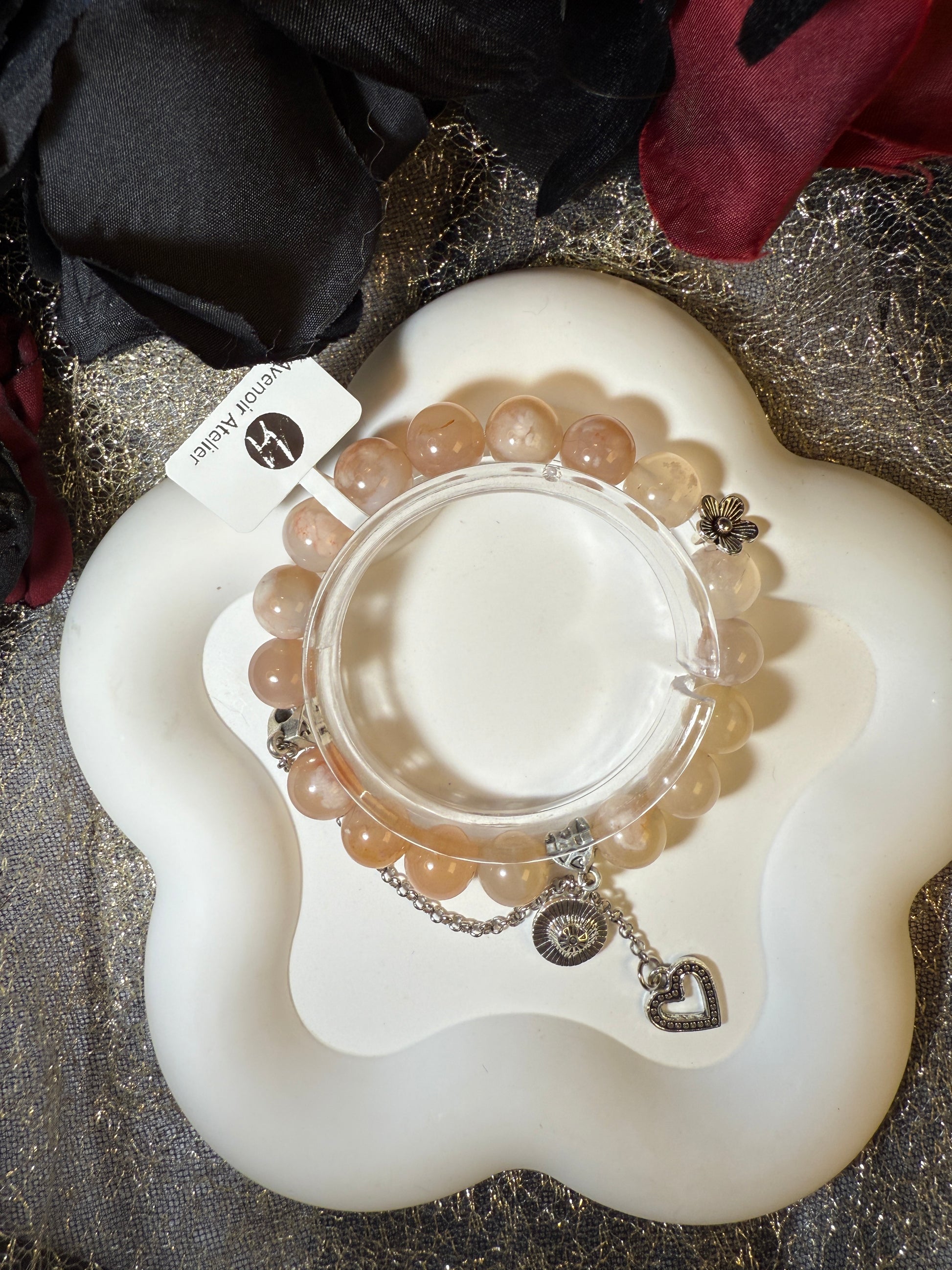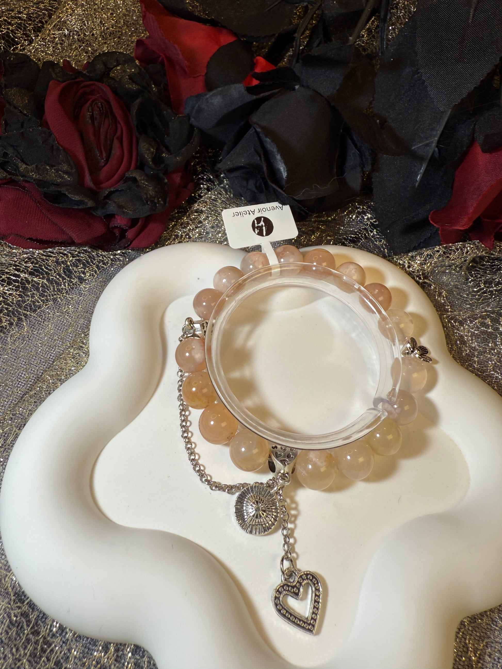 Dear Solace is a soft offering for the tender-hearted. Made with delicate Sakura Agate, whose creamy pink and translucent layers resemble petals caught in gentle spring rain, this bracelet carries the warmth of quiet comfort. The silver heart charm rests at the center like a whispered promise: that softness is strength, and healing doesn’t have to be loud. It is a piece that invites you to return to yourself—with kindness, with patience, with grace.