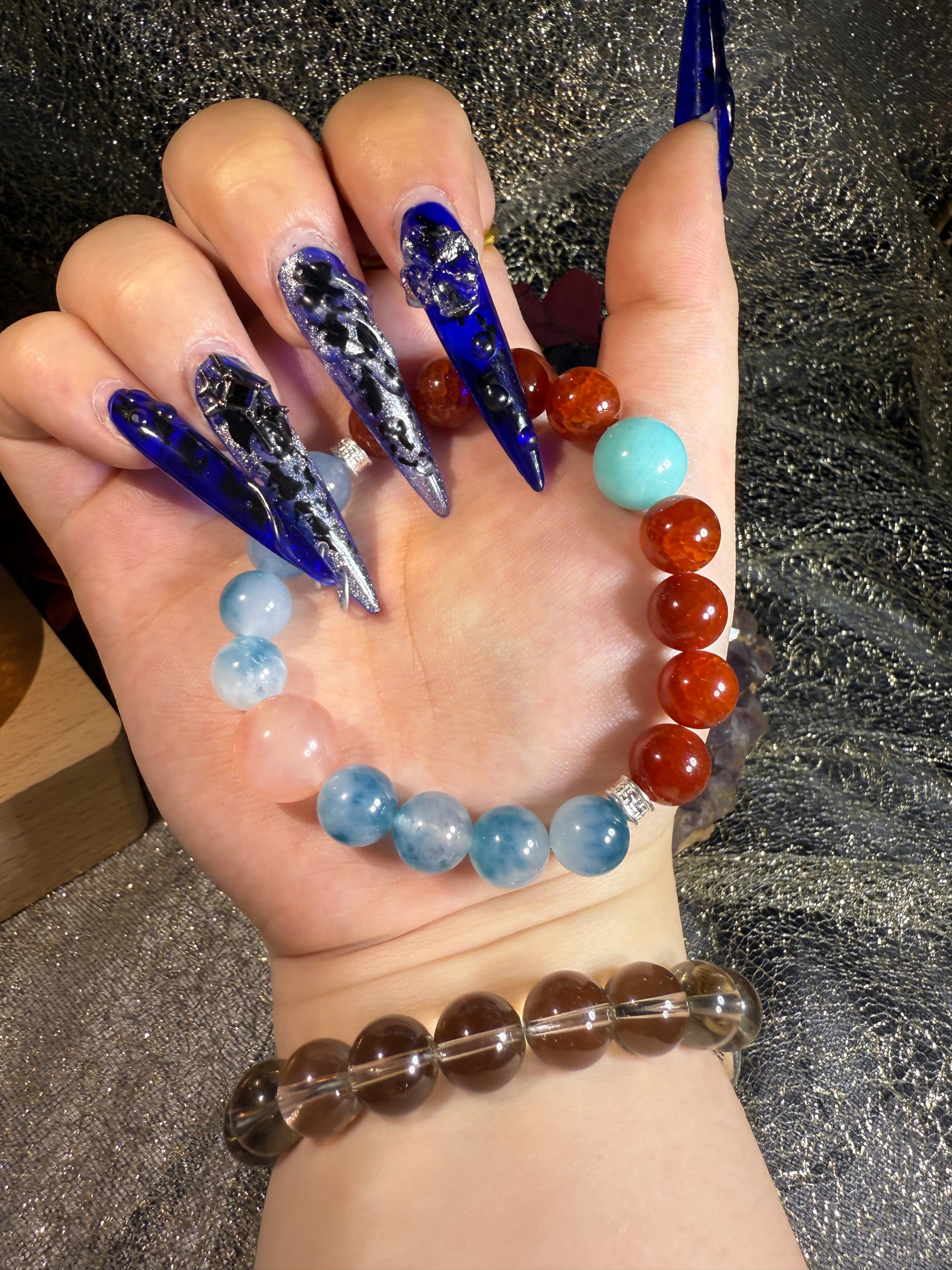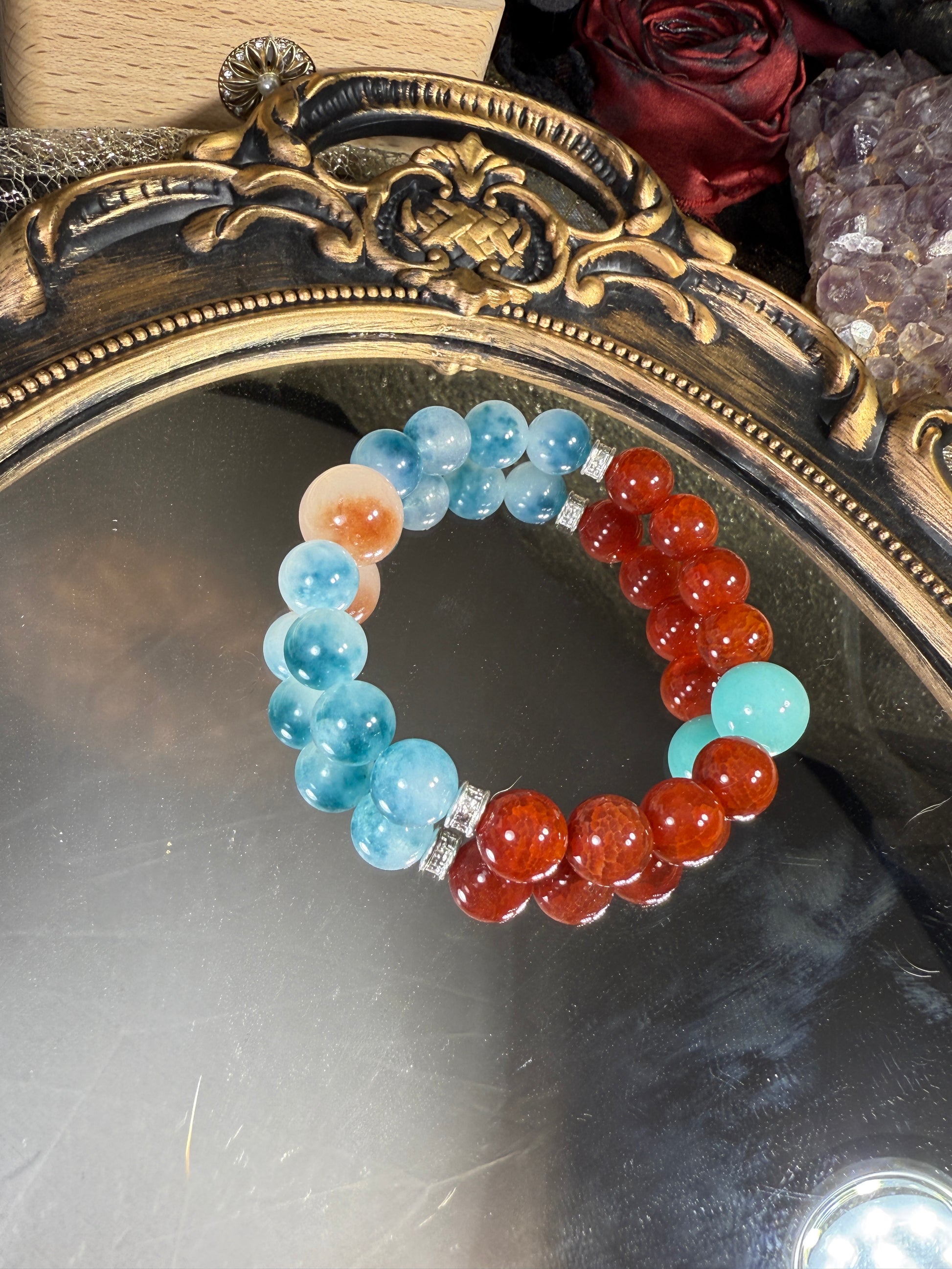 Dragon Tide — A striking bracelet uniting the fiery power of Dragon Vein Agate with the serene flow of Chalcedony, accented by a single South Red Agate and Amazonite bead. Its palette of ocean blues and ember reds captures the moment when waves meet flame, symbolizing courage that flows like water and strength that burns like fire.