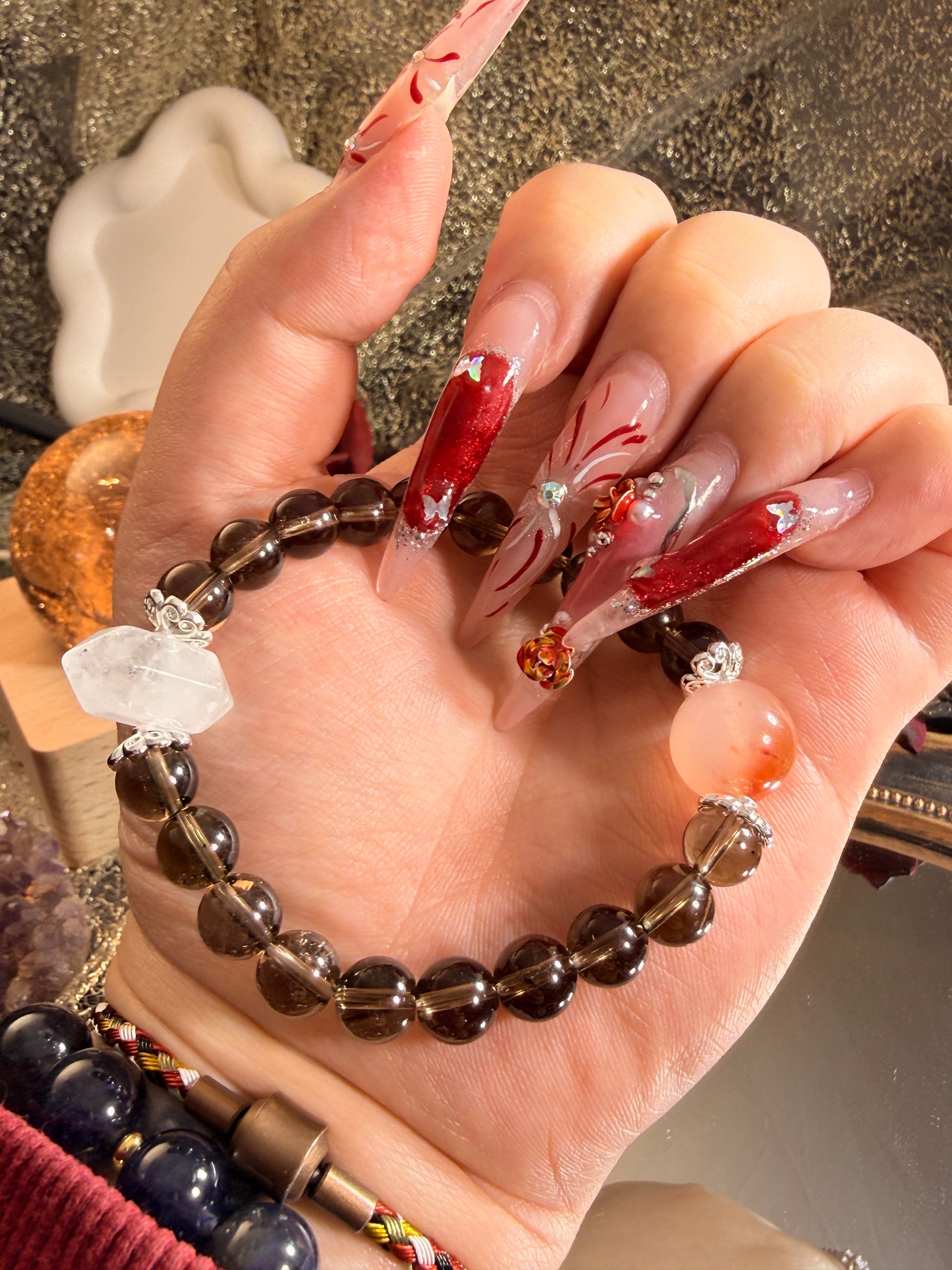 Nan Hong agate carries a deep, grounded warmth—passionate yet composed. Smoky quartz stabilizes the emotional field, absorbing excess tension and anchoring the wearer in calm awareness. At its center, a double-terminated clear quartz channels energy with direction and balance, allowing intention to move without scattering.