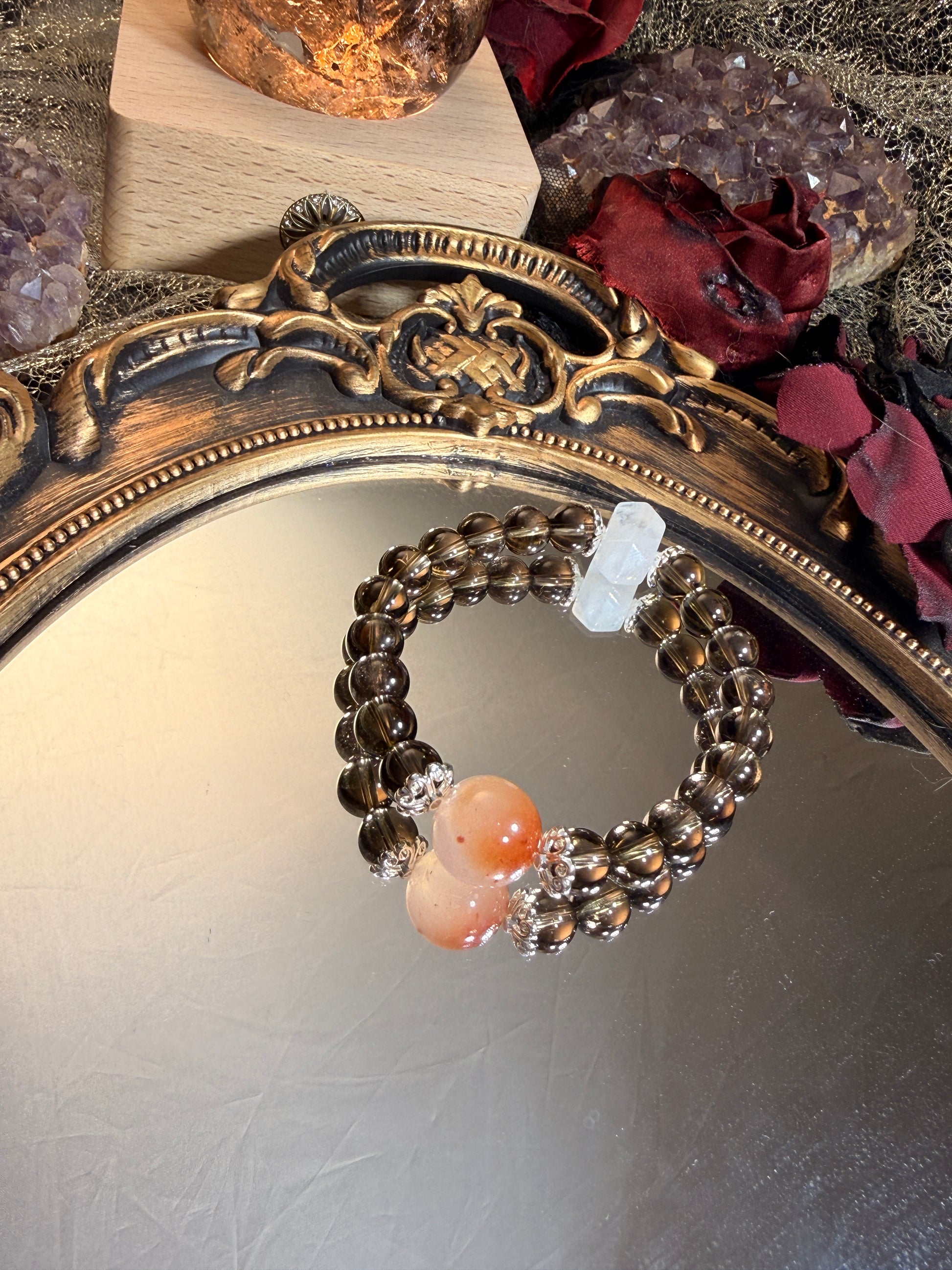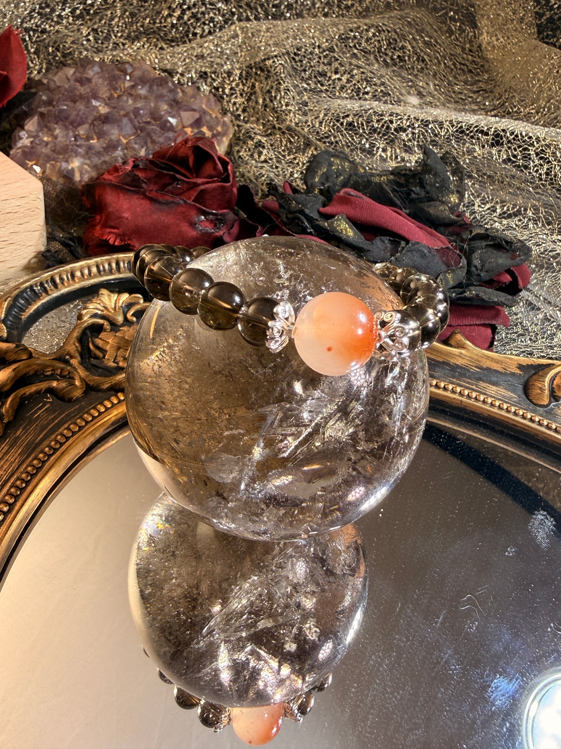 Designed with Nan Hong agate, smoky quartz, and a double-terminated clear quartz point, this piece holds fire without chaos.
