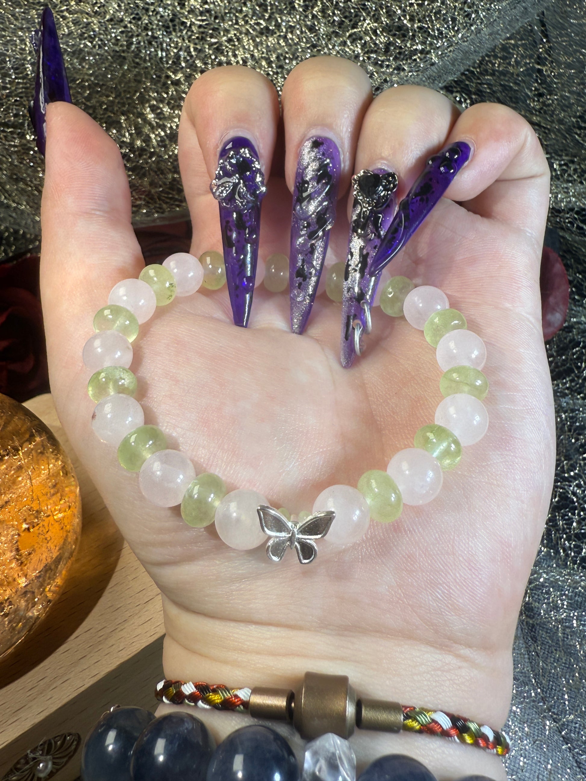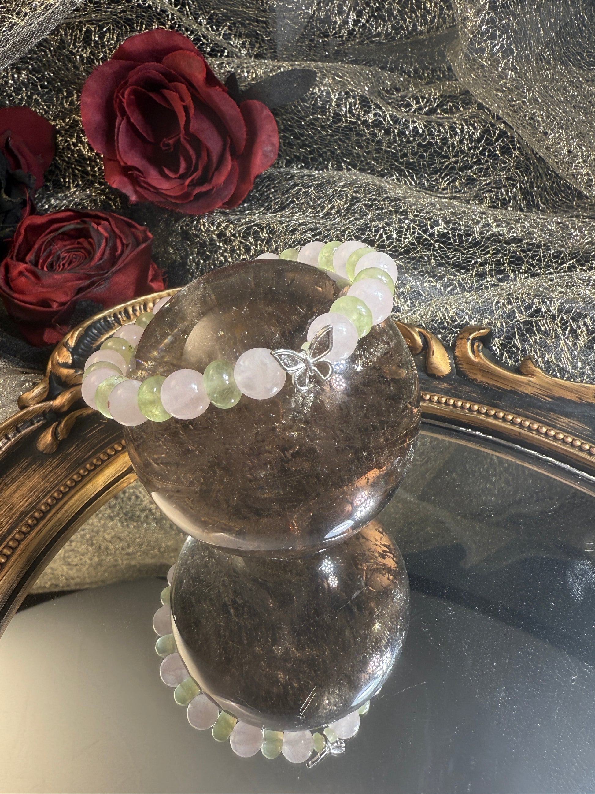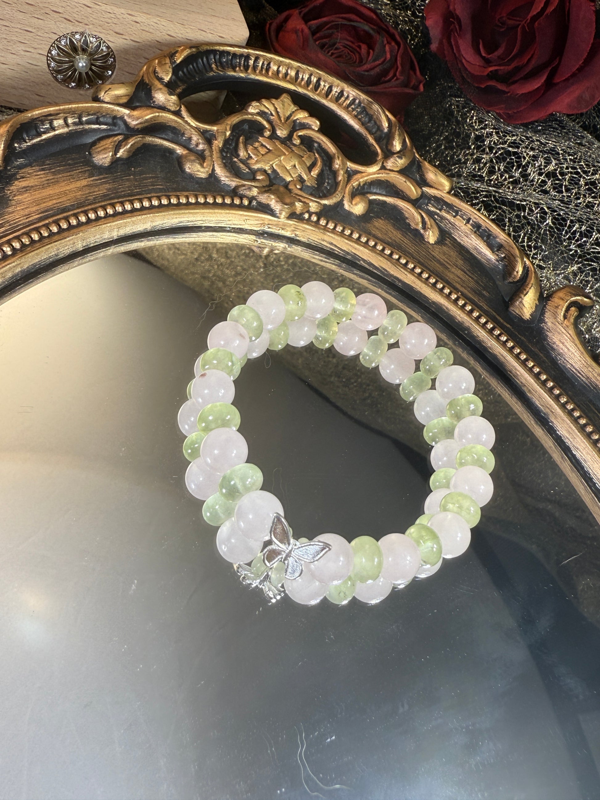 Floret Wing is a gentle embrace of soft rose quartz and translucent prehnite, accented with a delicate silver butterfly centerpiece. Its airy pastel palette evokes the serenity of spring gardens, offering a wearable charm of grace and emotional calm.