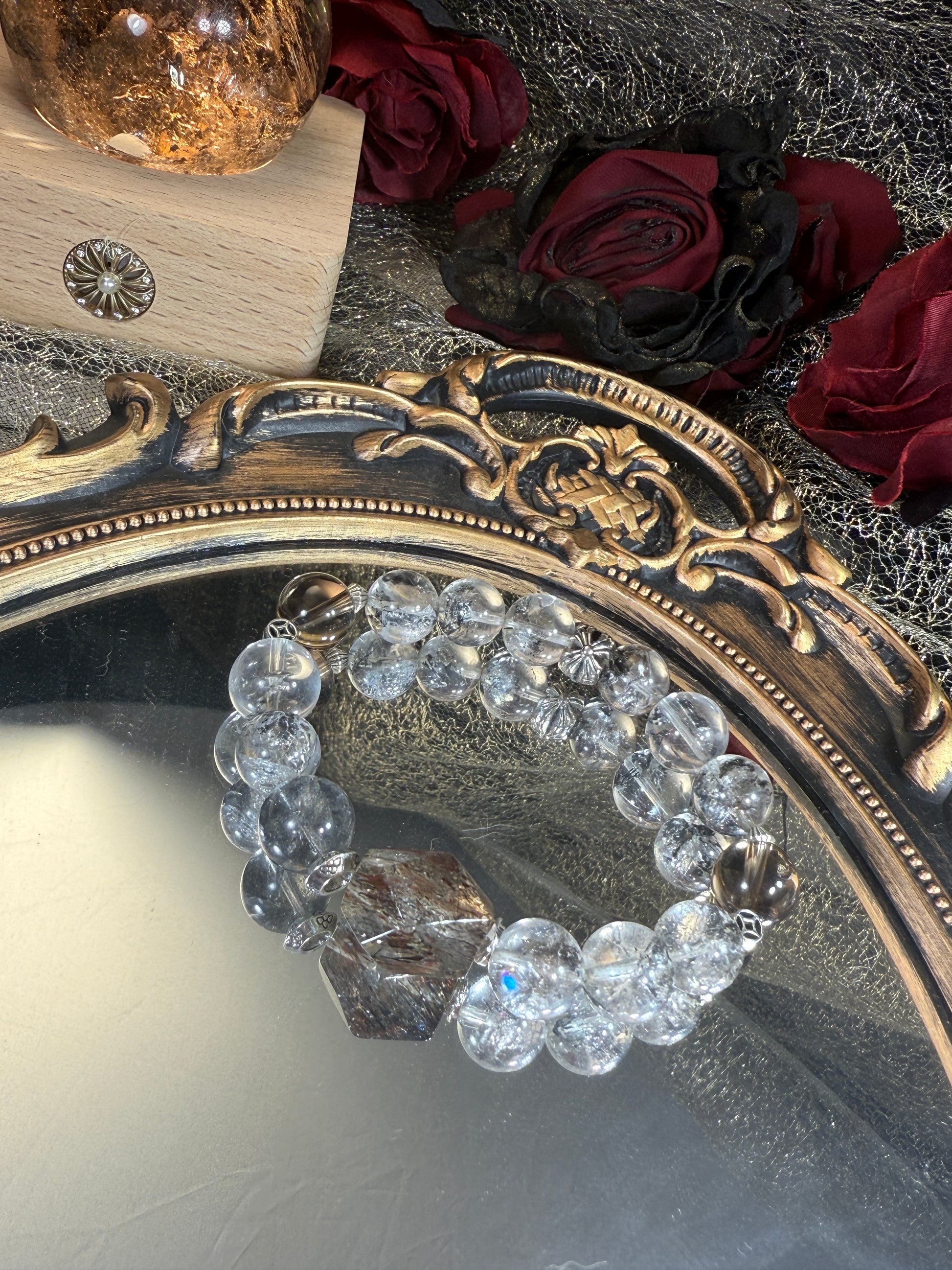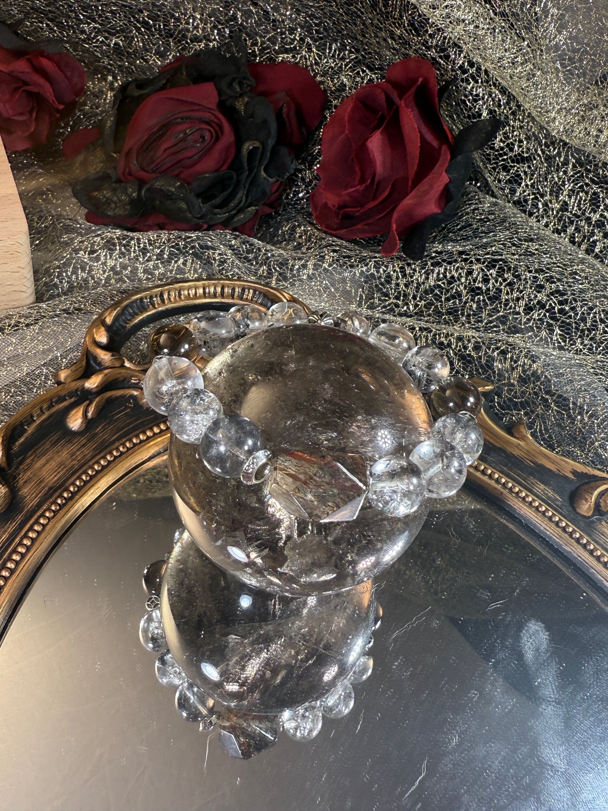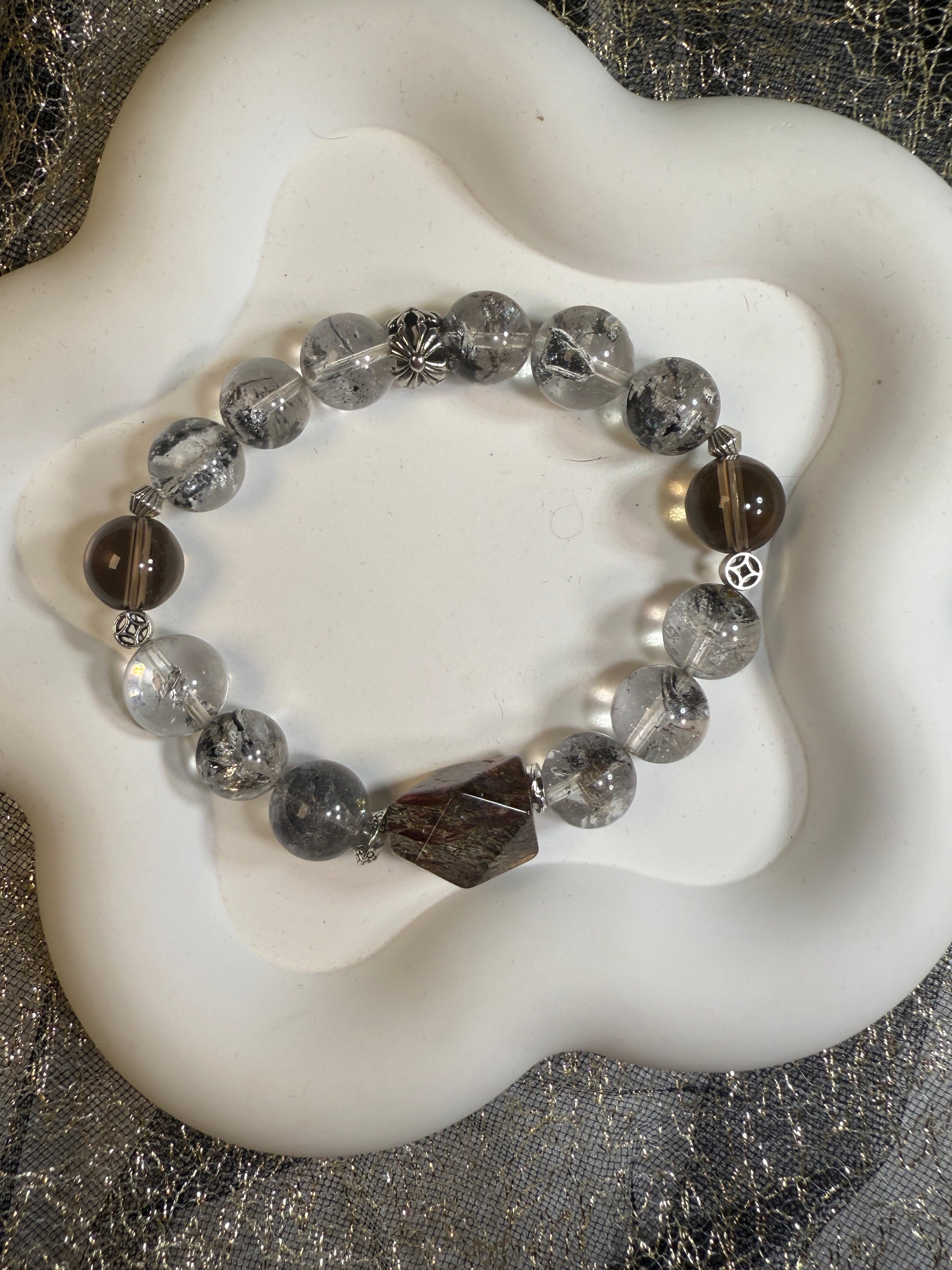 A talisman carved from shadow and stillness—Graven Silence evokes the mystery of buried truths and forgotten echoes. Each bead bears a story, veiled in grey mist and layered time, grounded by the whispering gravity of black gold super seven and the contemplative gaze of smoky quartz.