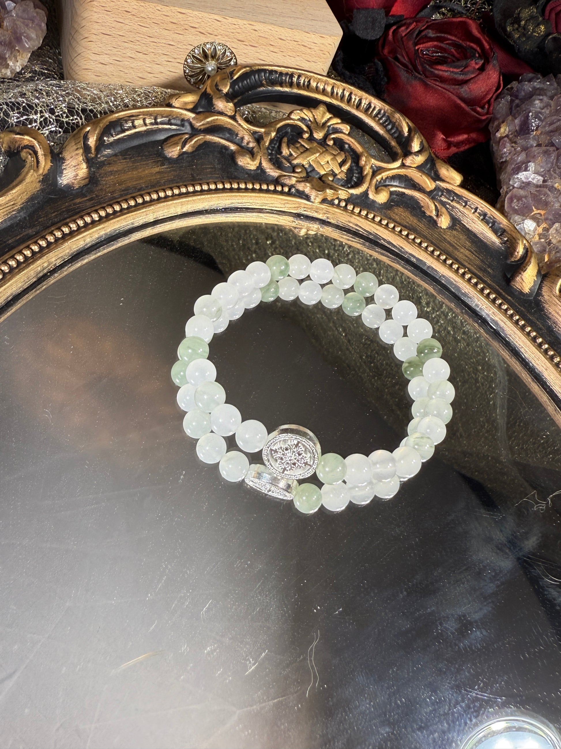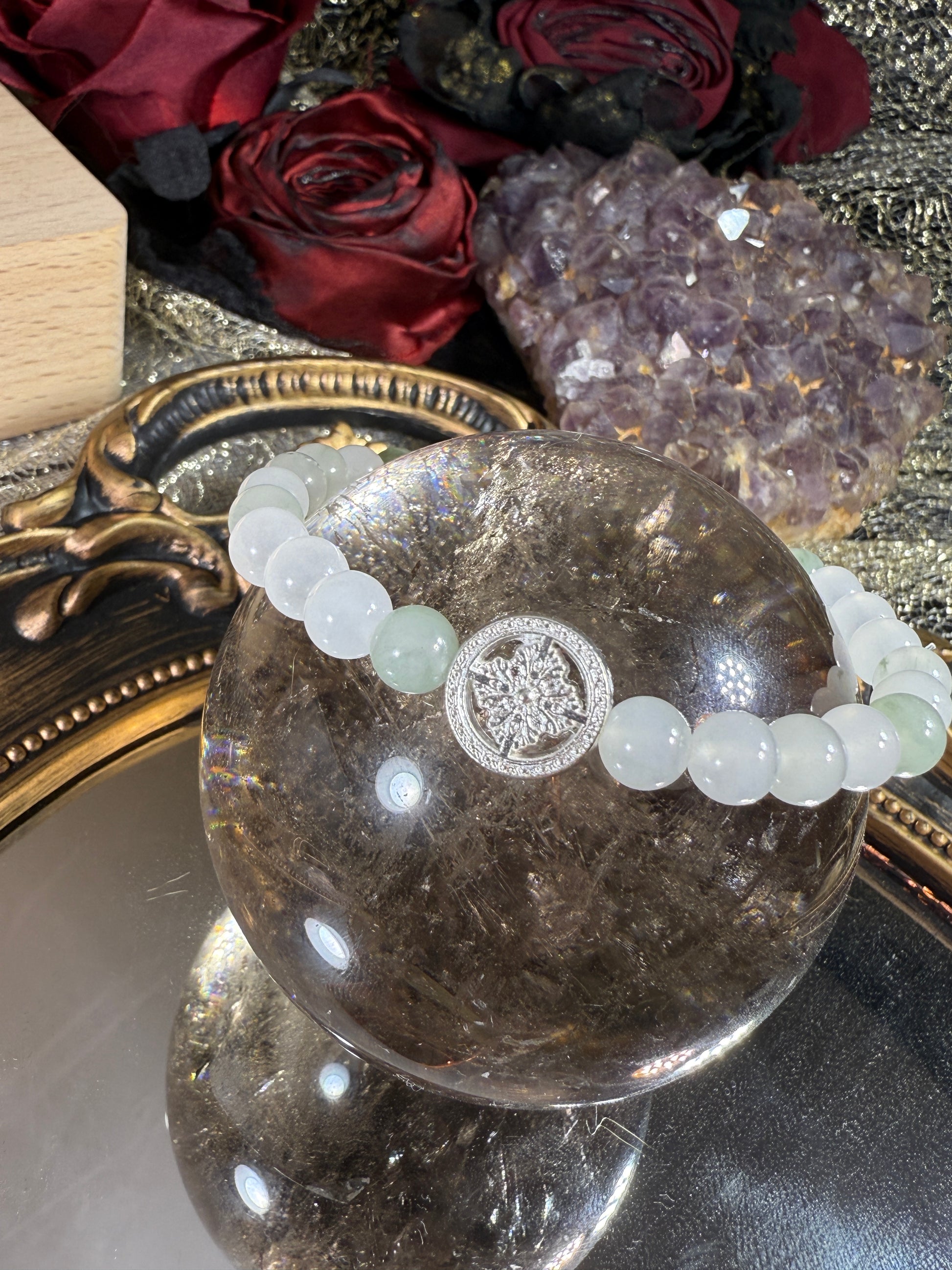 Hand-strung with luminous Tianshan jade, this bracelet captures the serenity of snow-capped peaks and the quiet strength of mountain ridges. Its soft, frosted green-white hues carry a calm, timeless aura, like a crown carved by nature itself.