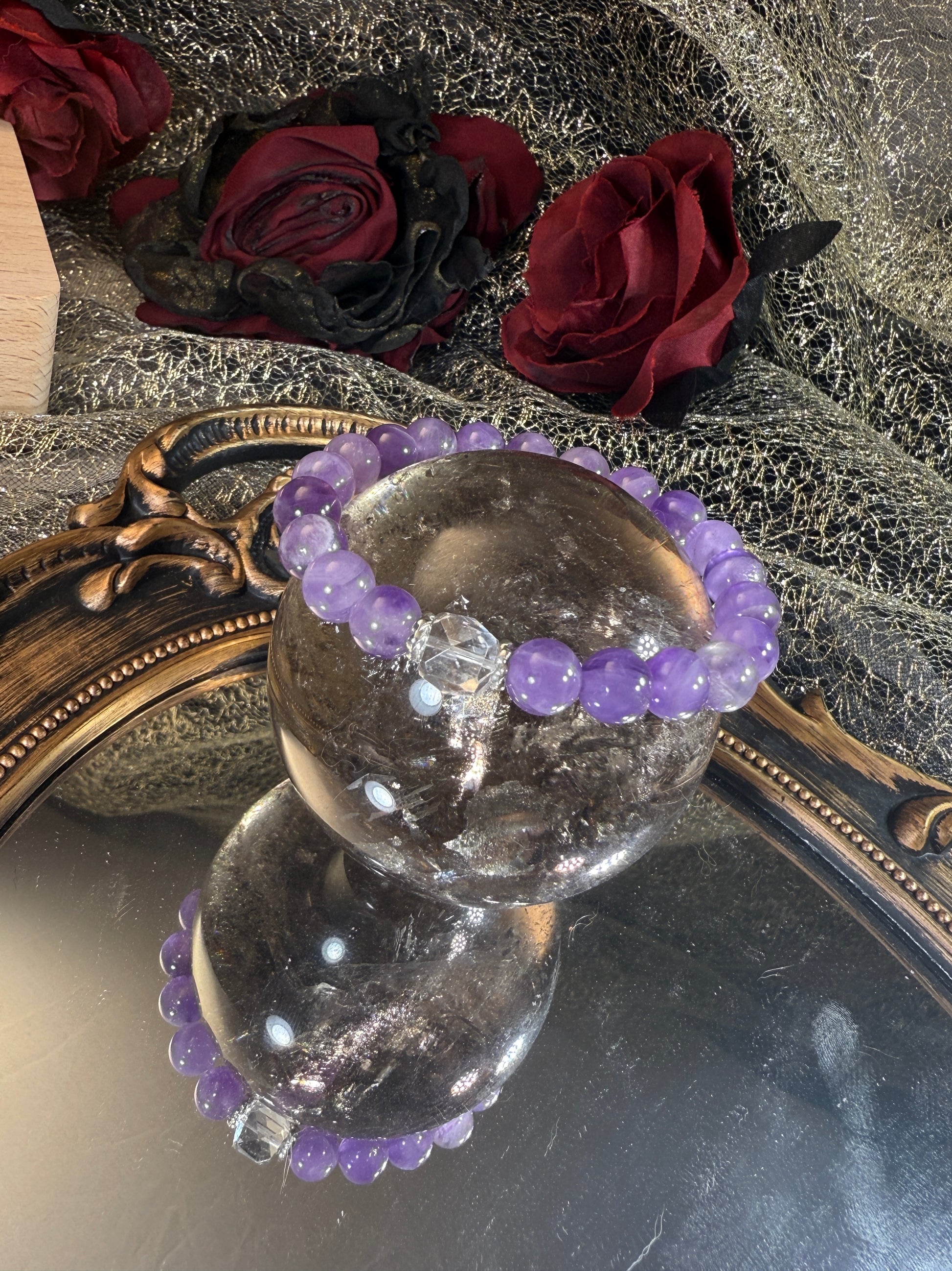 A quiet ache wrapped in clarity—Lilac Wane pairs twilight-hued amethyst with a single carved cube of icy white quartz. The contrast is gentle but deep, evoking a fading sky, a closing thought, a final word left unspoken.