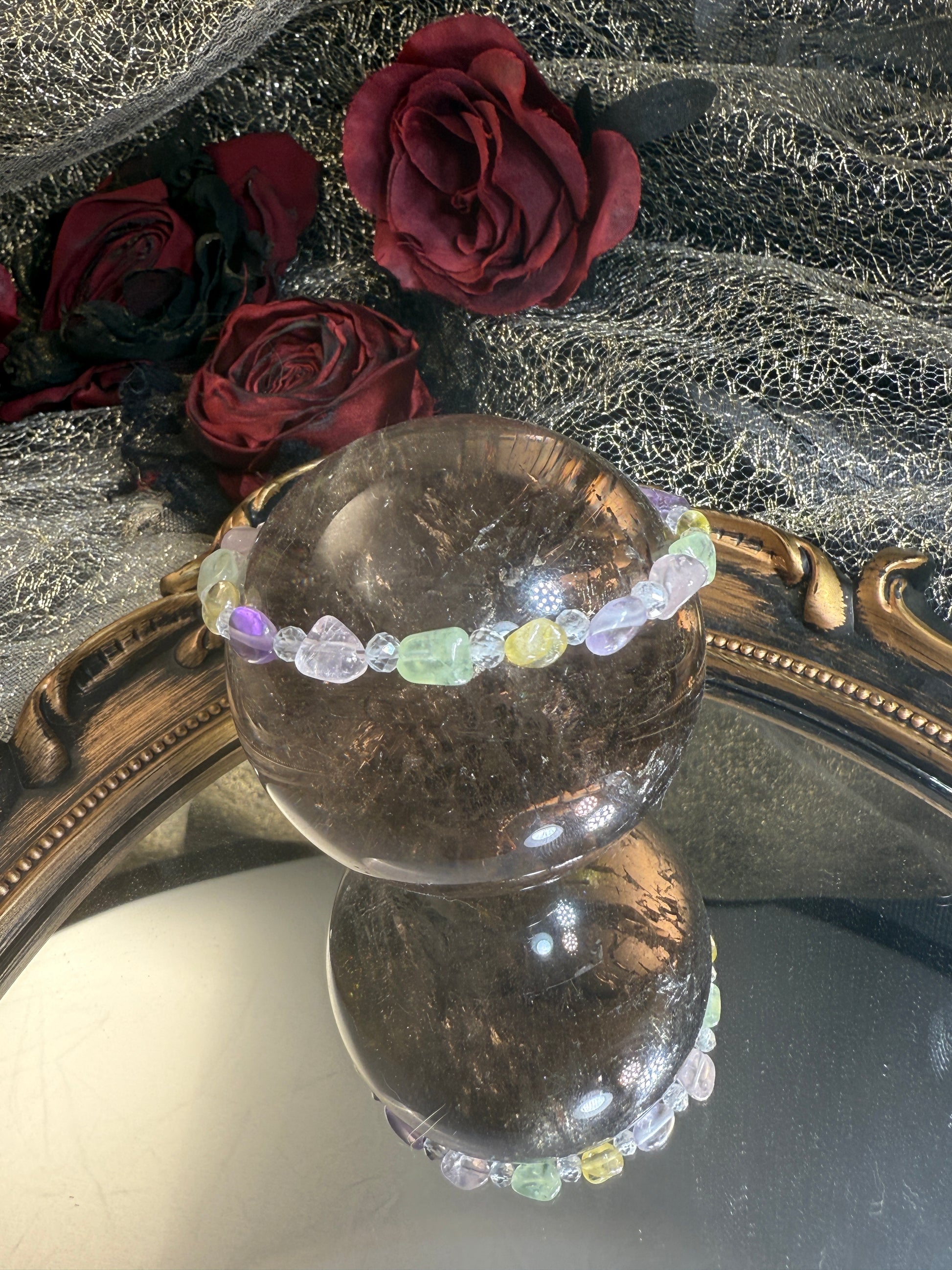 A whimsical dance of color and light, Lunabelle Drops is a candy-like strand composed of polished Rose Quartz, Amethyst, Citrine, and Green Quartz. Each bead reflects a hue of moonlit innocenceāpink, purple, gold, and minty greenāinviting the wearer into a realm of playful charm and gentle magic. Ideal for layering or wearing solo, this bracelet is a celebration of softness and inner radiance.