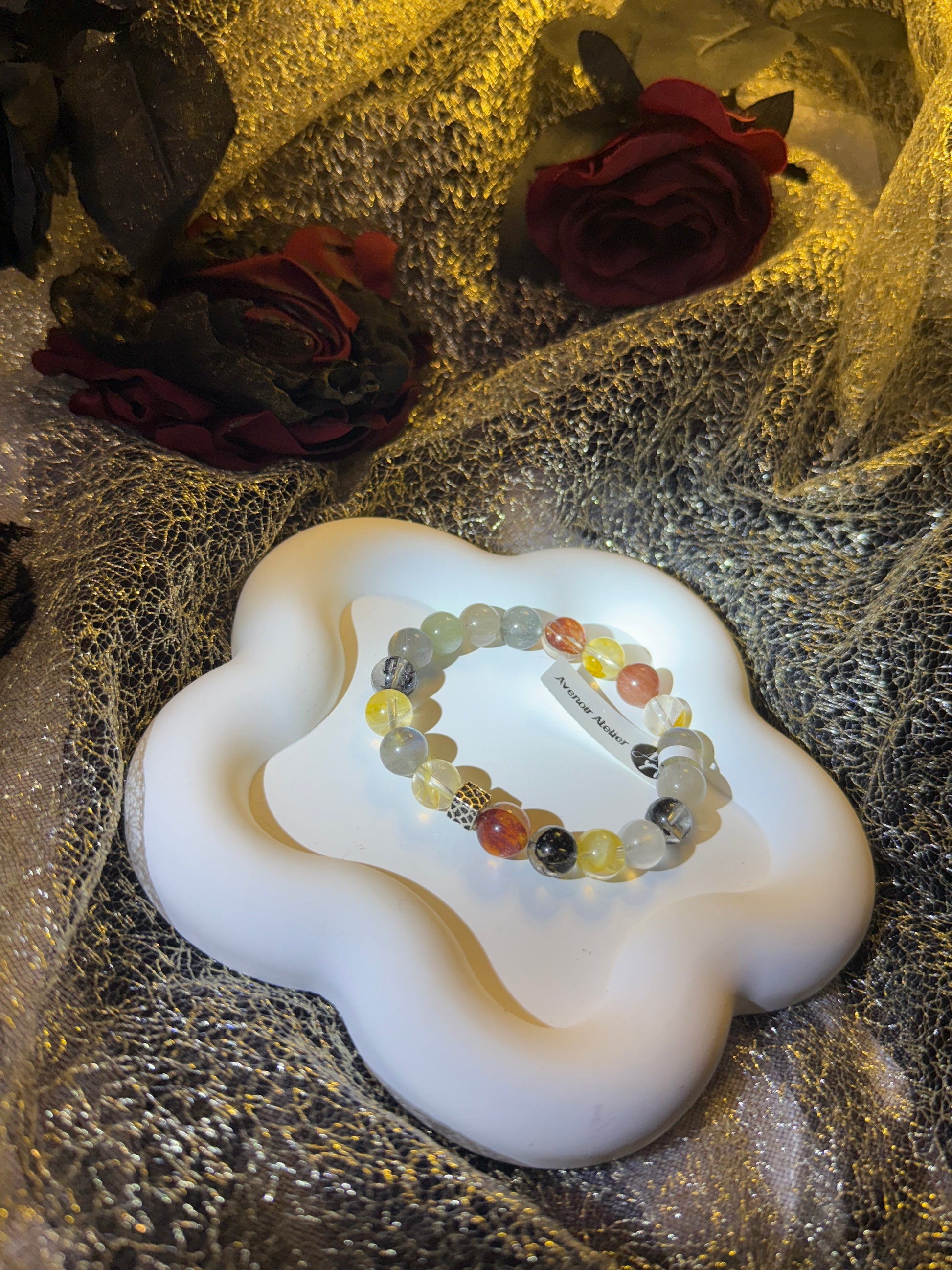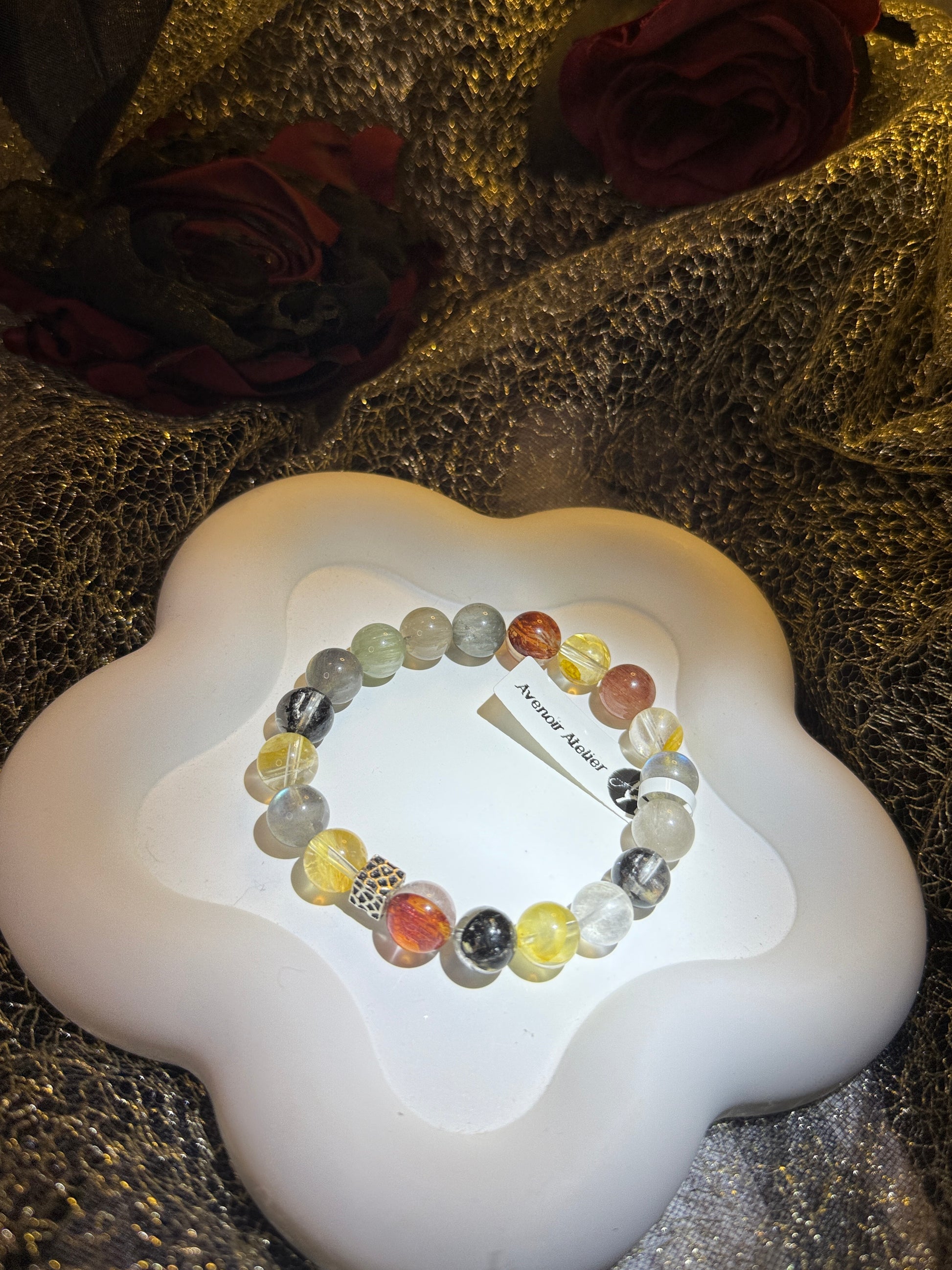 A dreamy composition of bunny hair quartz, phantom quartz, moonstone, and a delicate resin bloom. Each element was chosen not only for its beauty, but for the energy it carries: