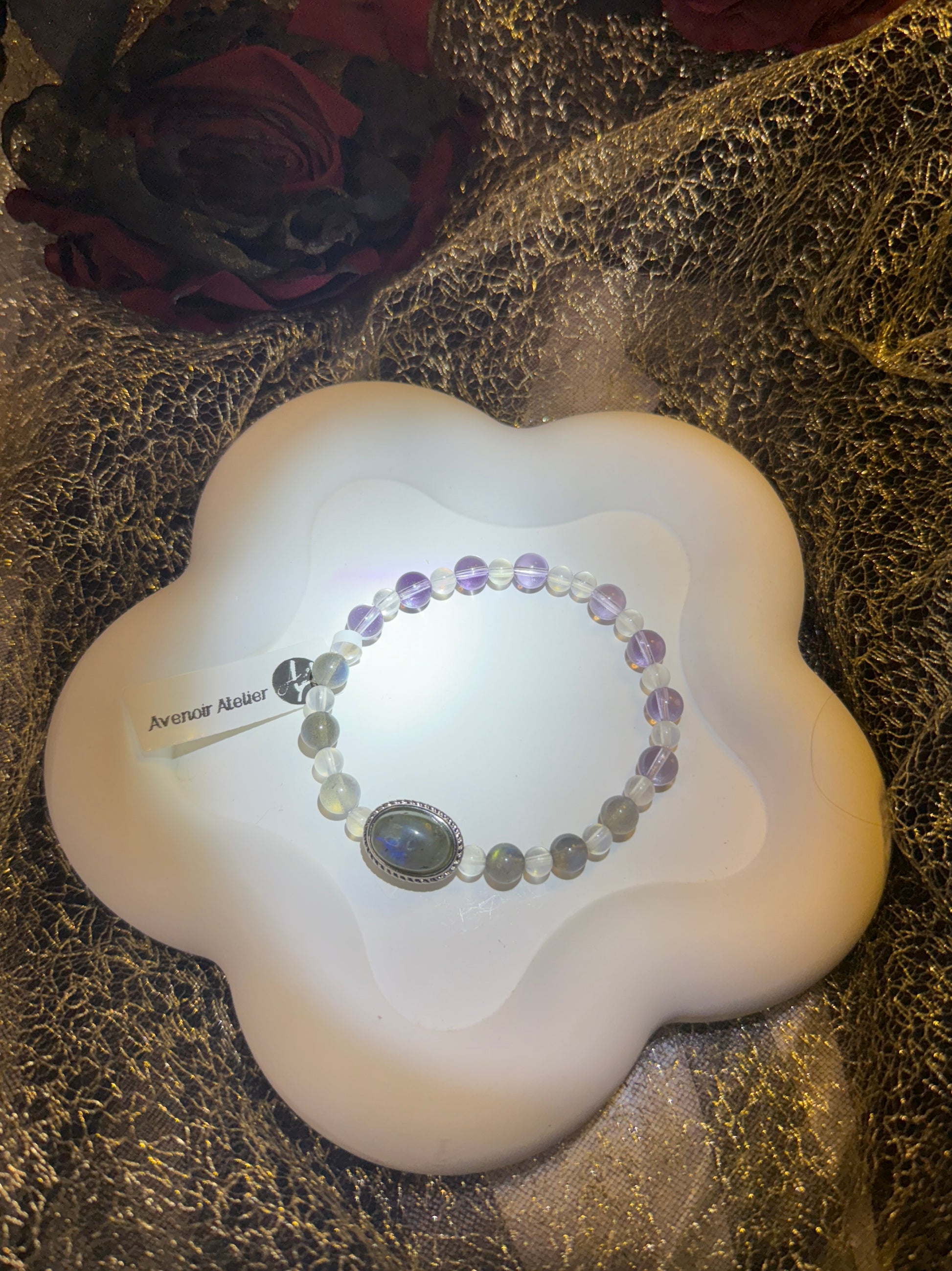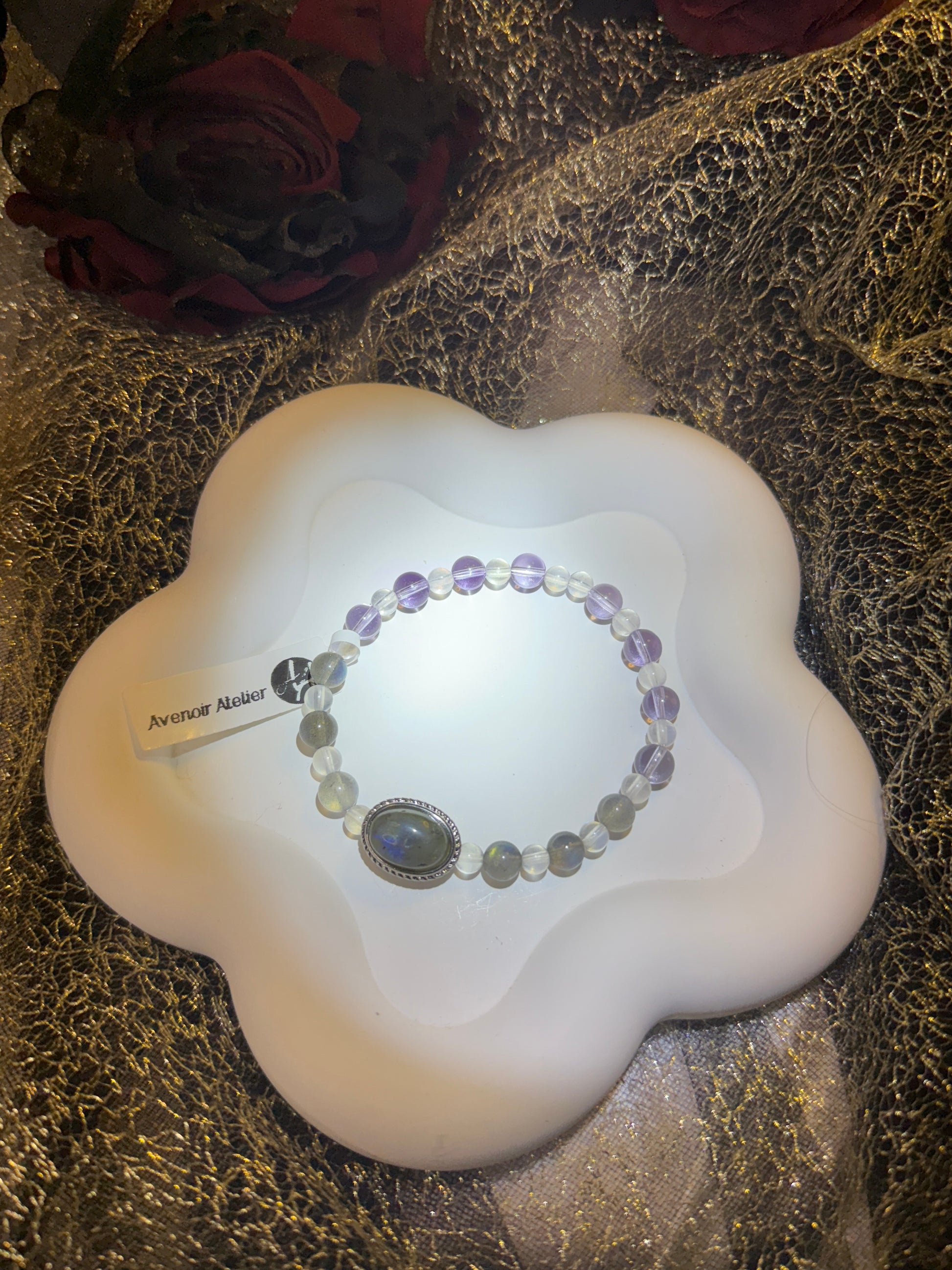 A tranquil dream woven from amethyst, blue and grey moonstone, and phantom moonlight. Lunar Reverie captures the stillness of a midnight sky—where intuition awakens and silence speaks. Amethyst soothes the spirit, while shifting shades of moonstone open portals to inner truth. This piece is a gentle invocation of lunar wisdom, ethereal balance, and dream-born clarity.