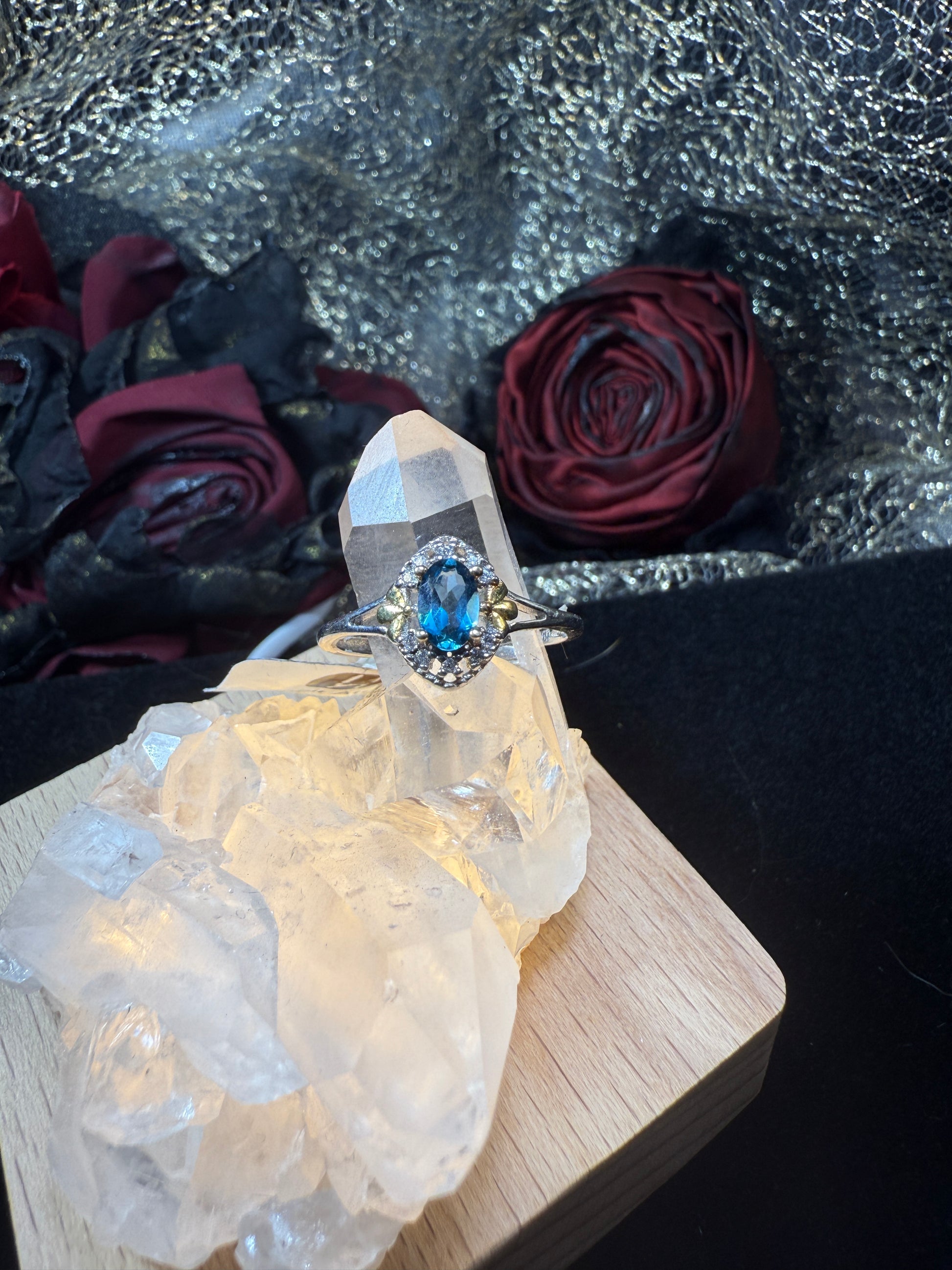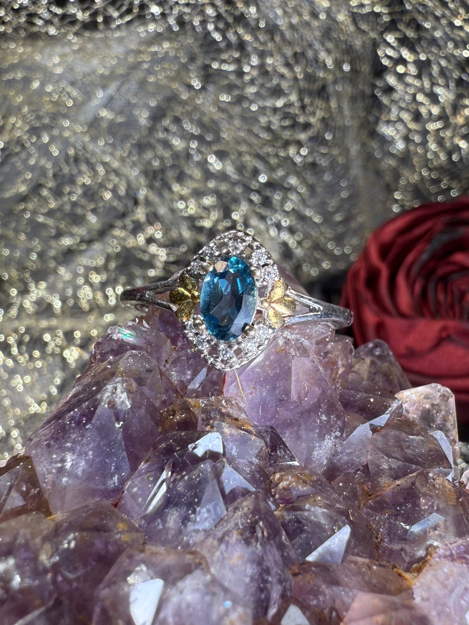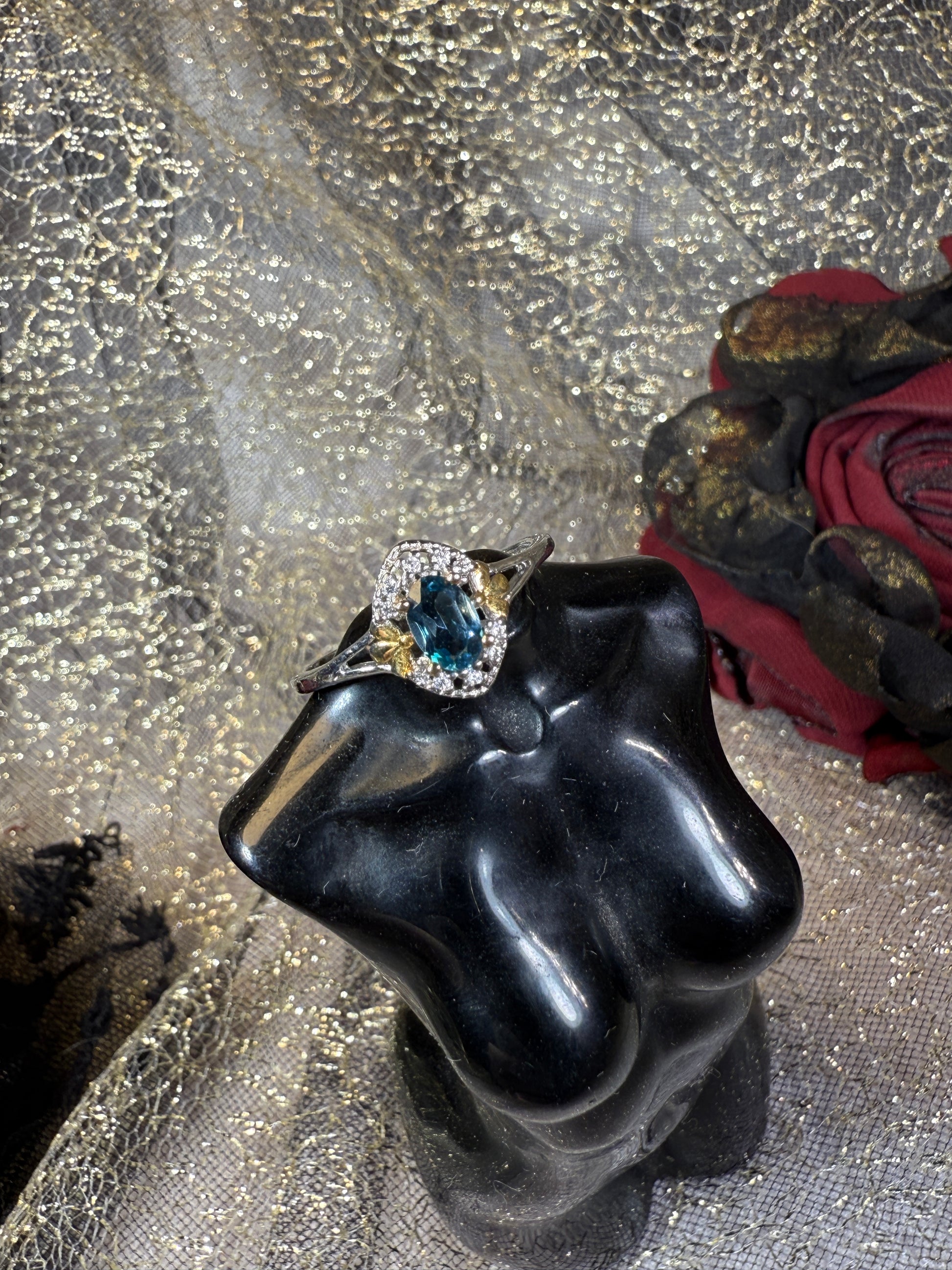 A wreath of silver and starlight — Midnight Wreath features a deep London blue topaz wrapped in golden leaves and a halo of brilliance. Mysterious, poised, and powerful, this ring carries the depth of oceans and the elegance of midnight skies.