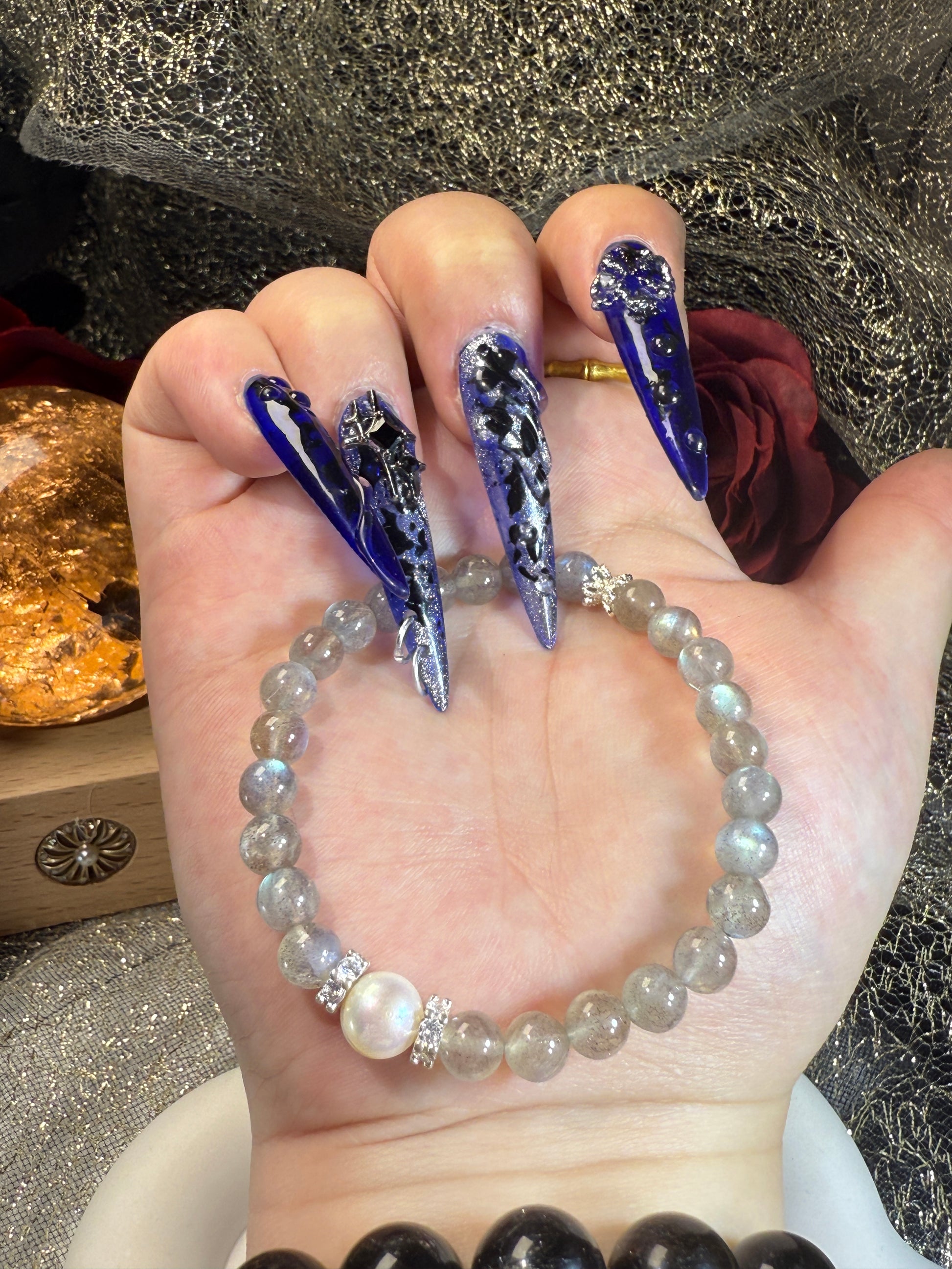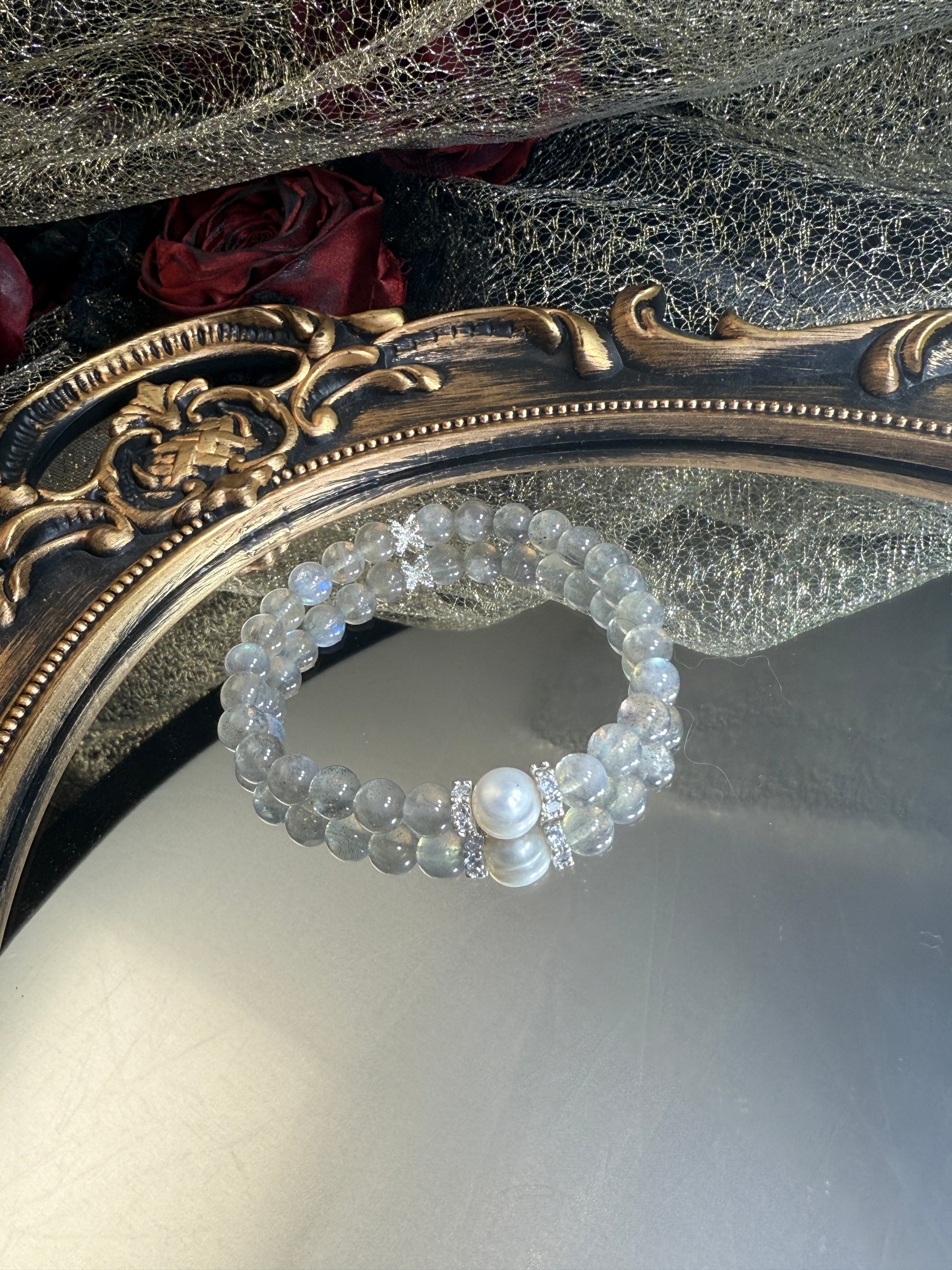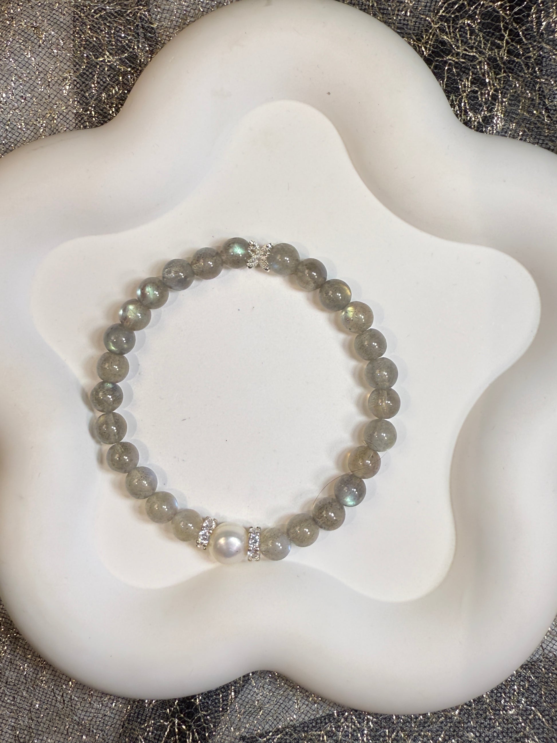 A luminous tribute to moonlit promises, Moonlit Dowry pairs the mystical shimmer of labradorite with the timeless elegance of freshwater pearl. Each bead catches the light with subtle blue-gray iridescence, while the single white pearl anchors the piece in classic grace. A celestial offering wrapped in quiet opulence.