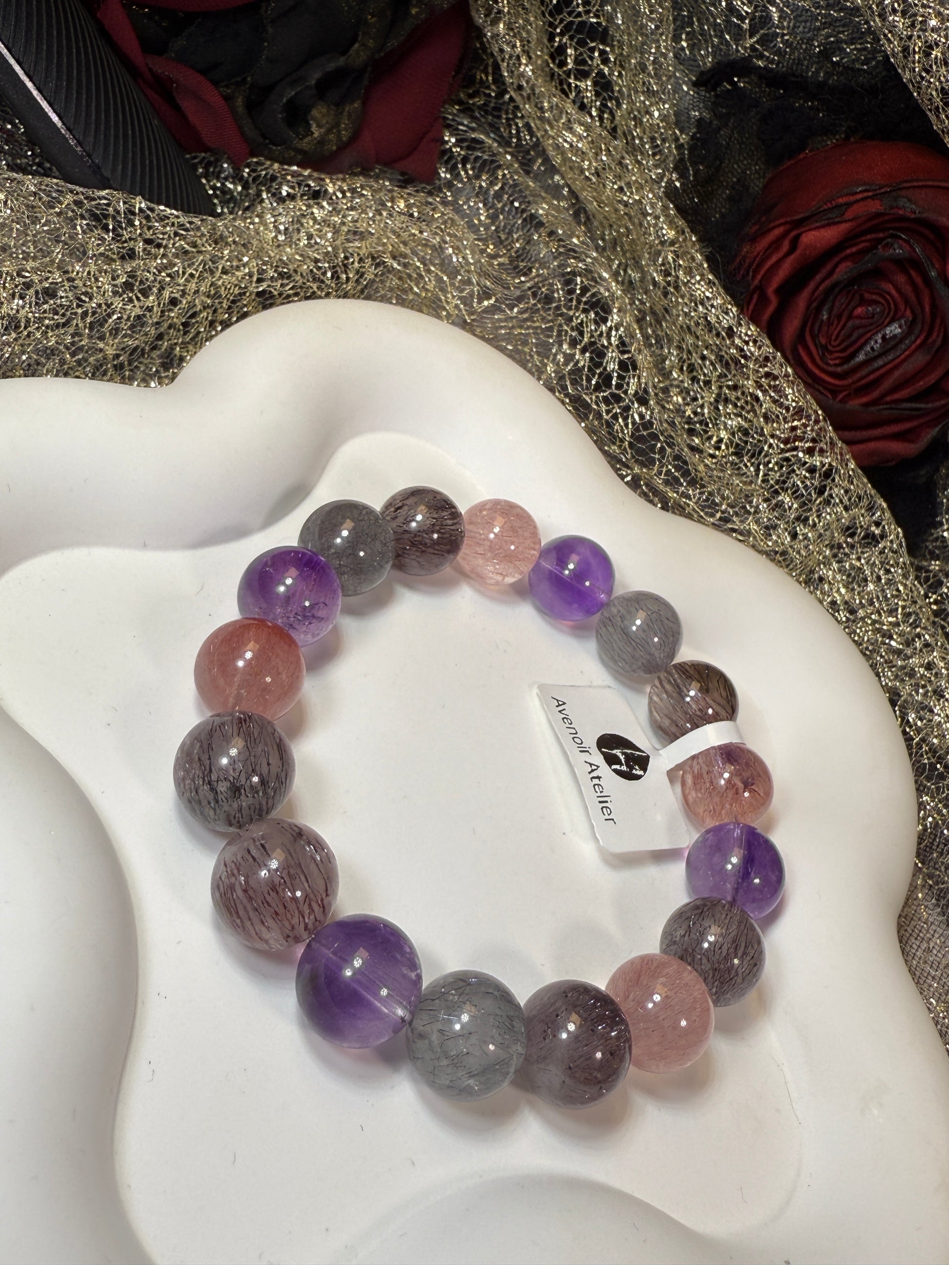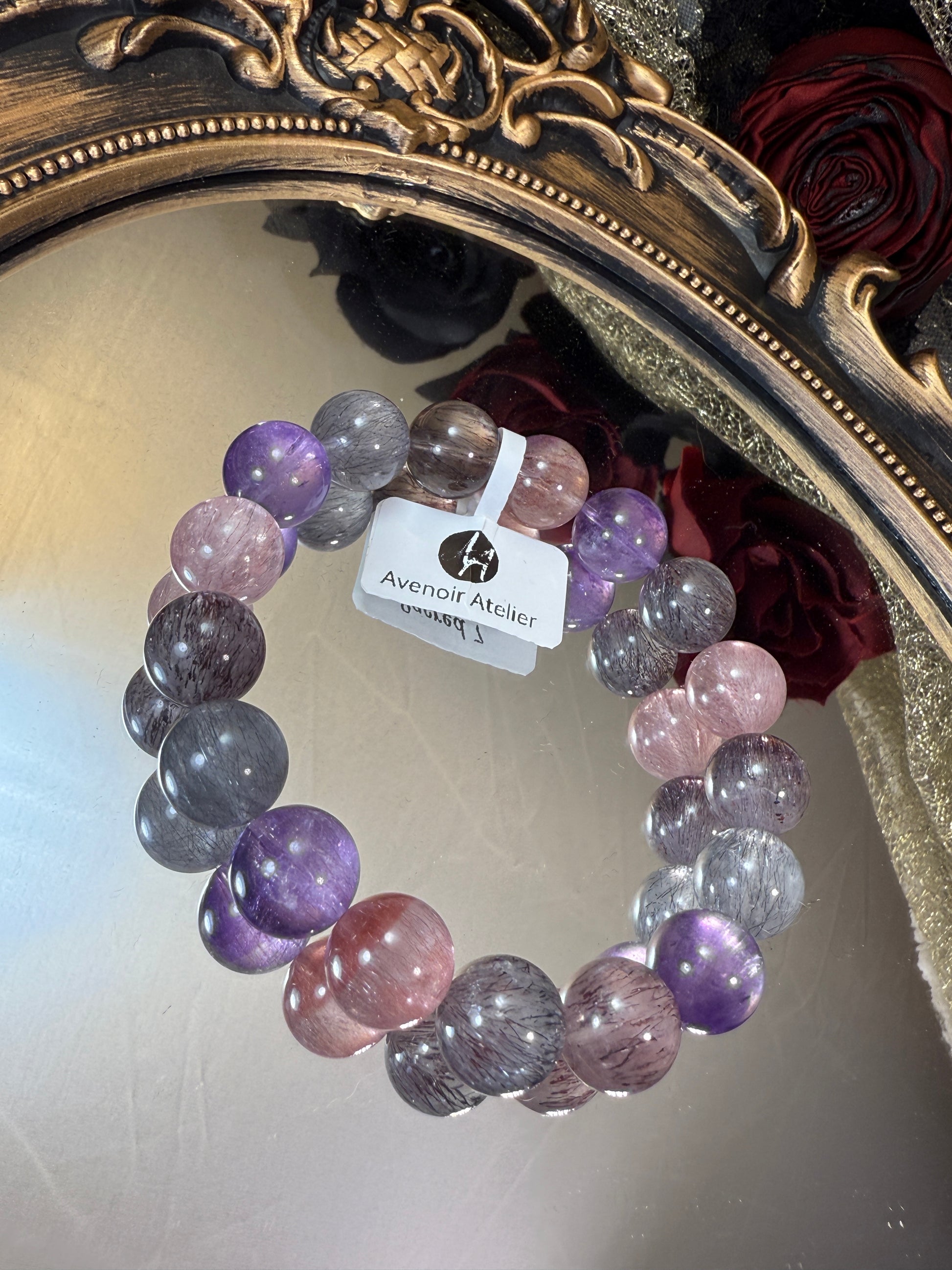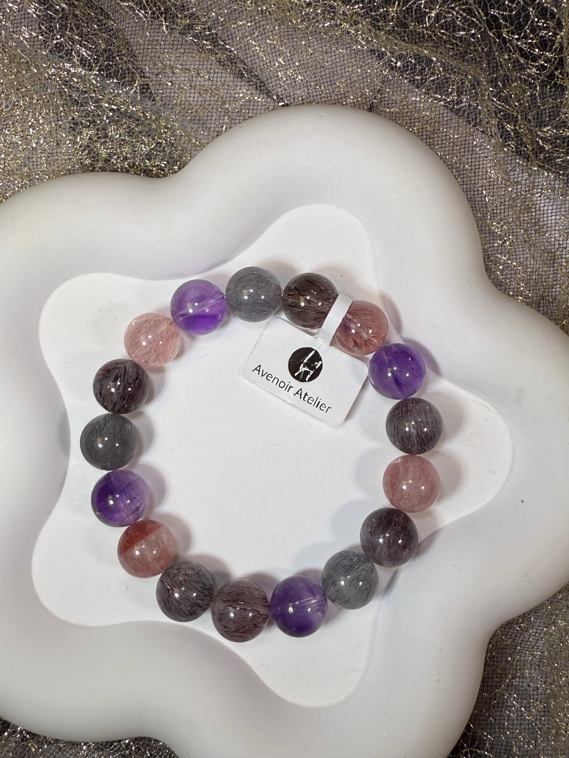 Sacred Seven, also known as Super Seven, is a rare union of seven minerals—amethyst, clear quartz, smoky quartz, cacoxenite, rutile, goethite, and lepidocrocite. It’s layered, ancient, and alive with frequency. A stone that doesn’t choose one direction, but holds all of them at once.
