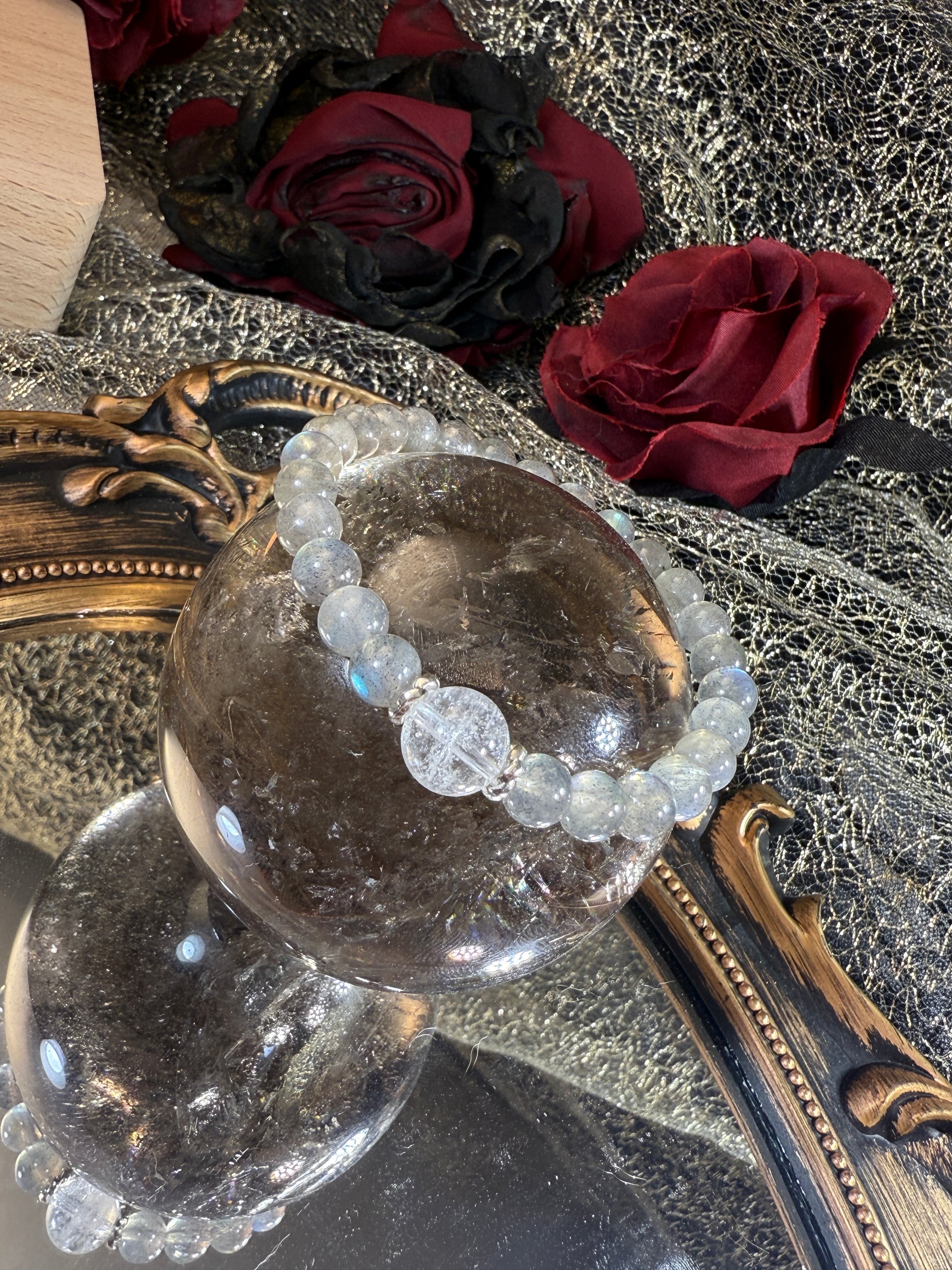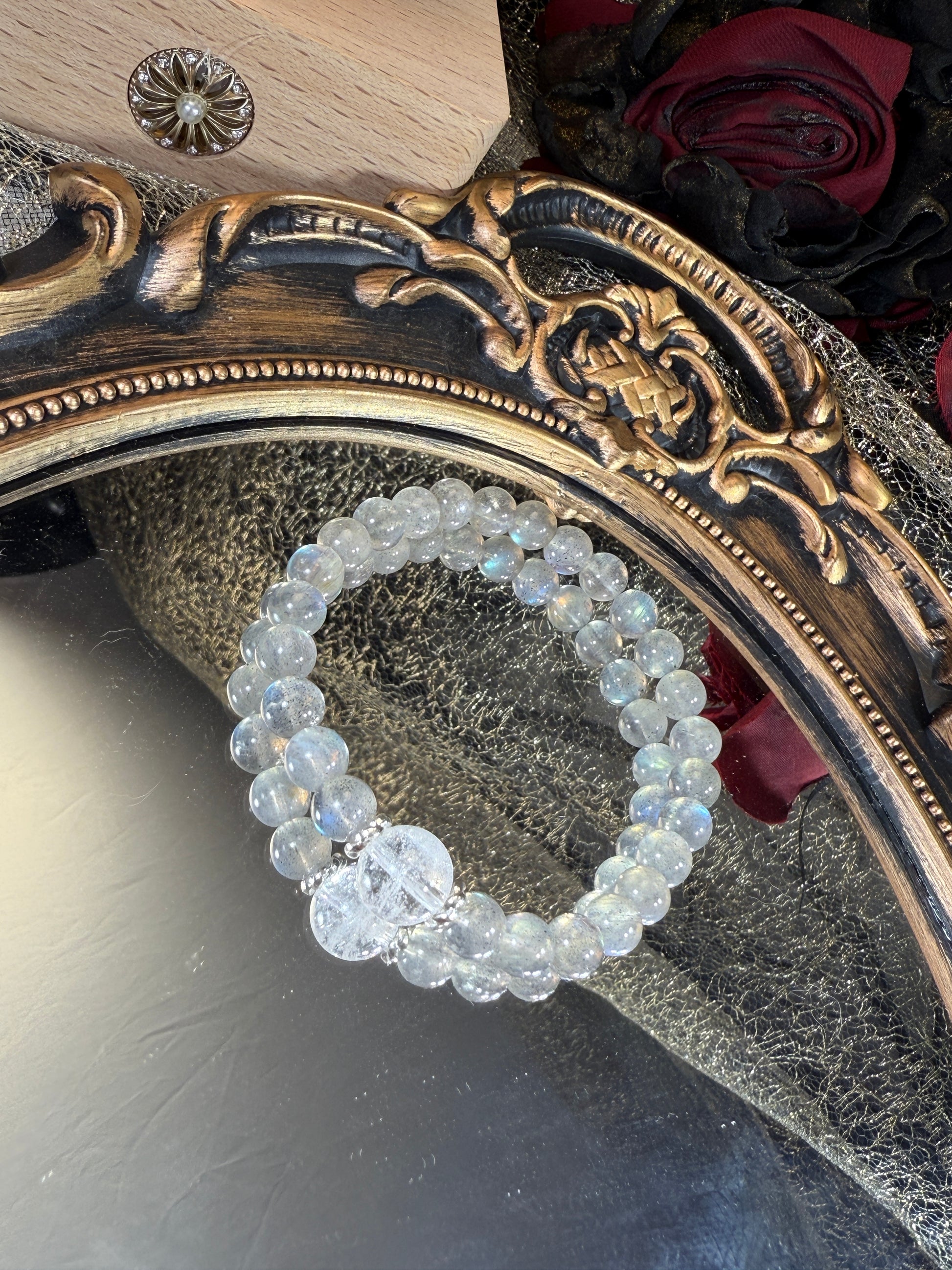 A celestial composition of grey moonstone and white apatite, Spectra Drift shimmers with quiet radiance and layered subtlety. The double-wrap design invokes movement and transformation, like stardust suspended in motion. Silver-toned details accentuate its cool-toned elegance—mystical, serene, and powerful.