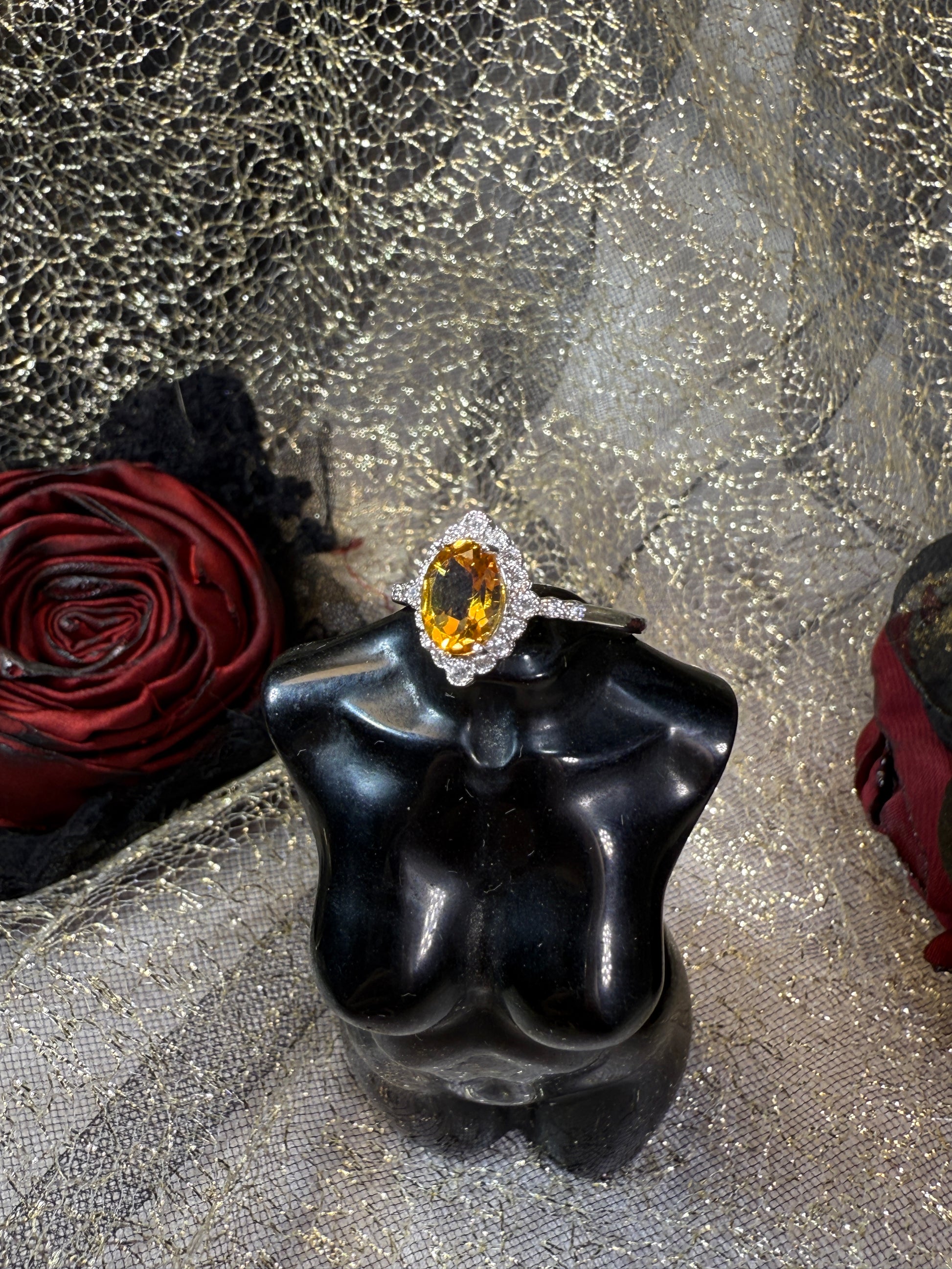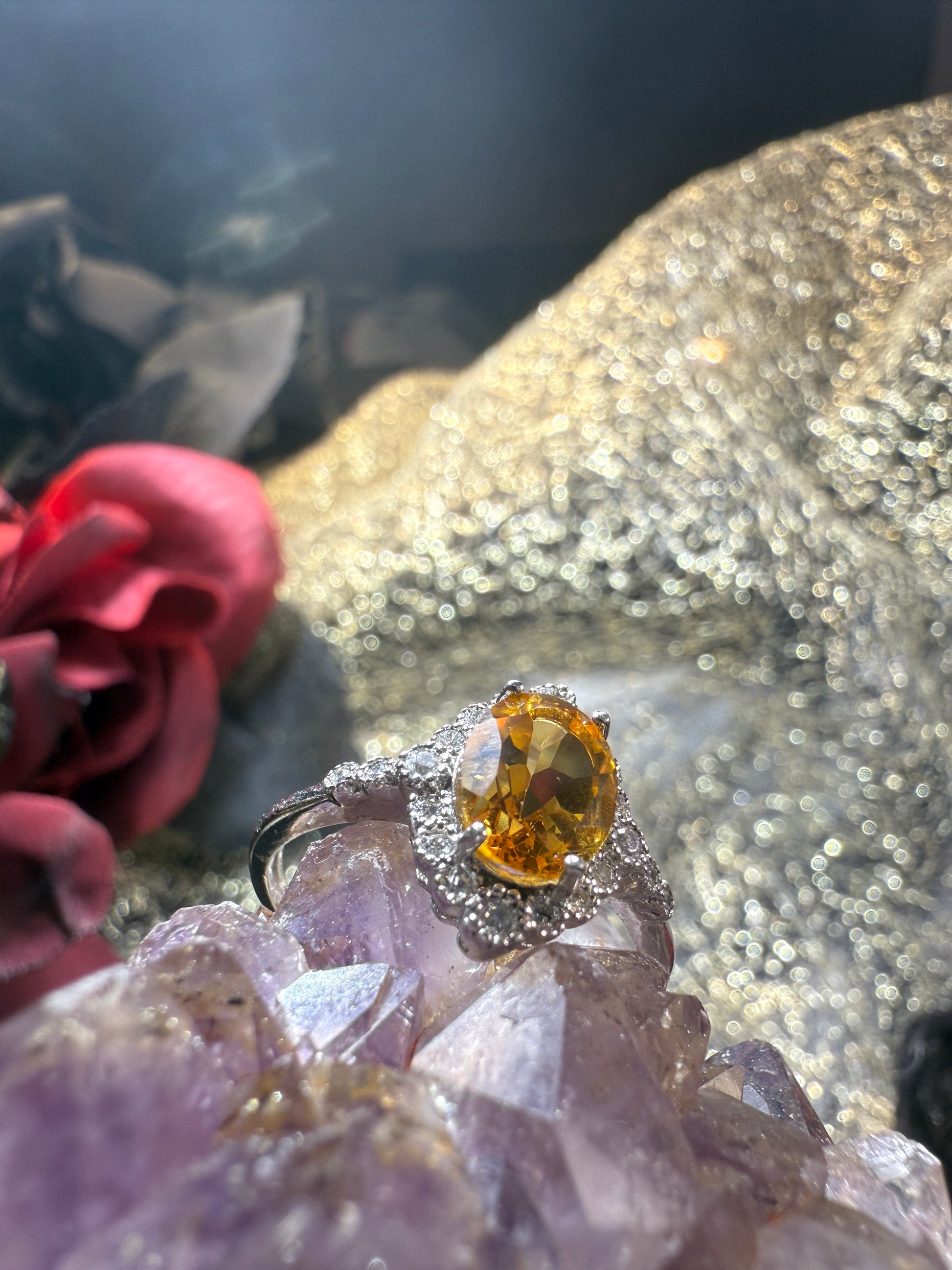 Glowing with golden warmth, the Sunheart ring features a radiant citrine center stone surrounded by a halo of shimmering accents. Crafted in sterling silver with an adjustable band, this piece channels abundance, clarity, and solar energy — a talisman for joy and courage.