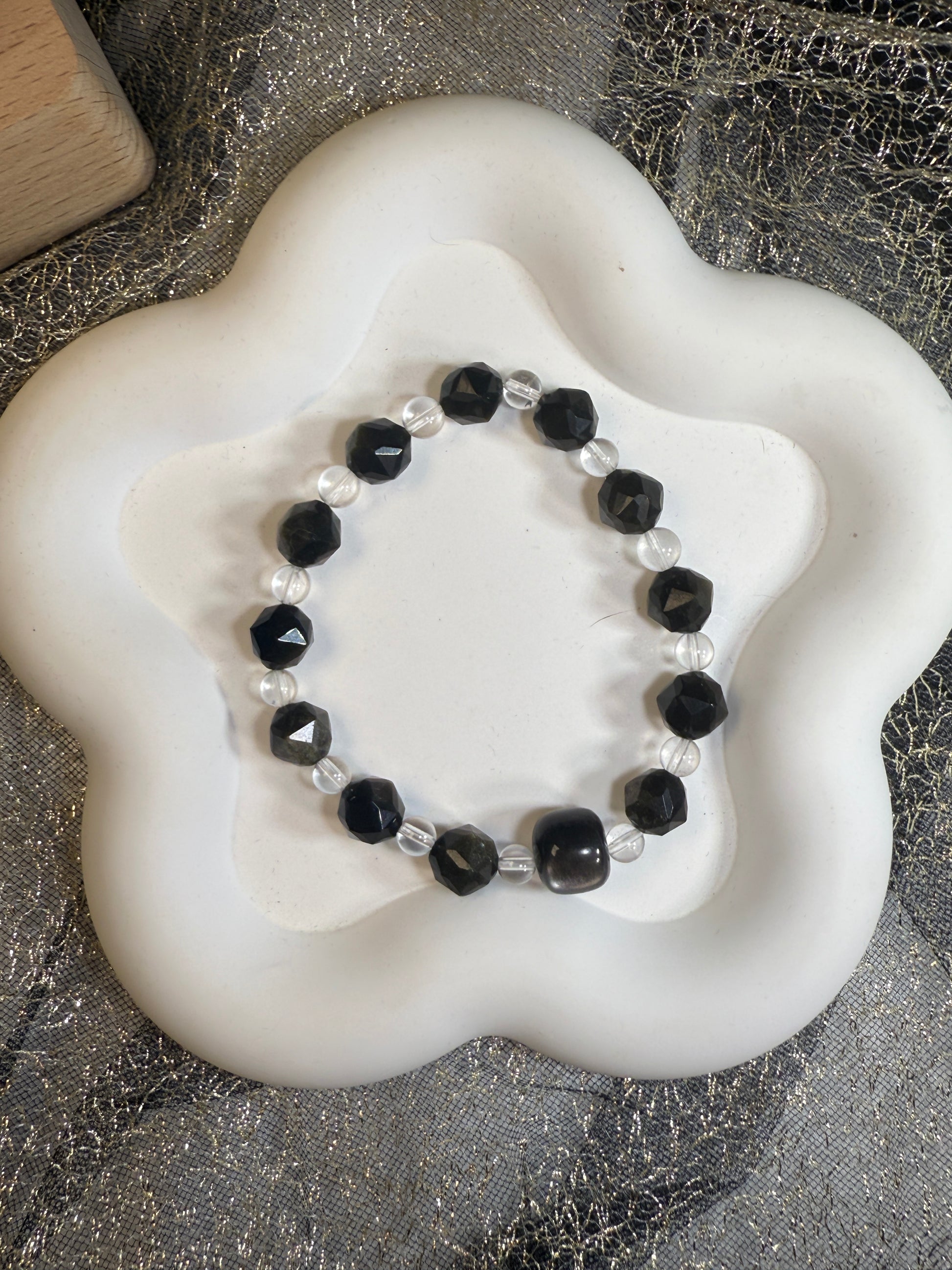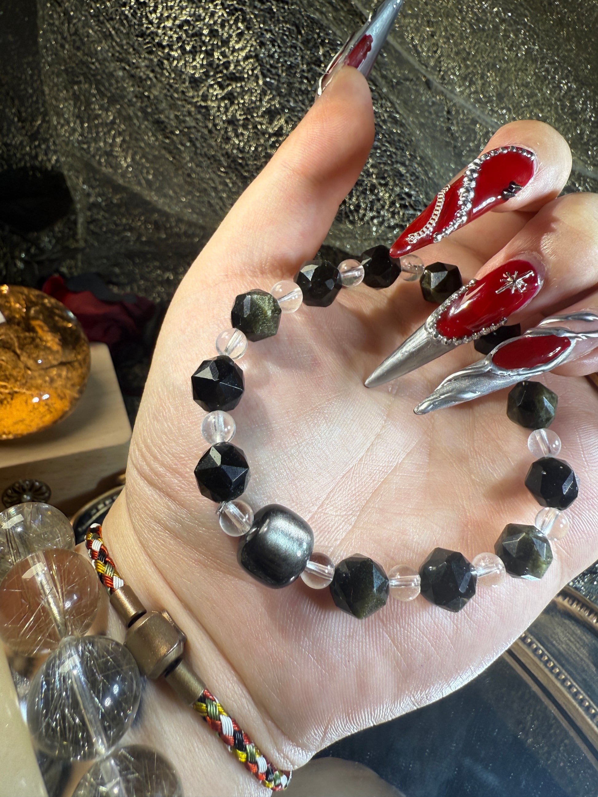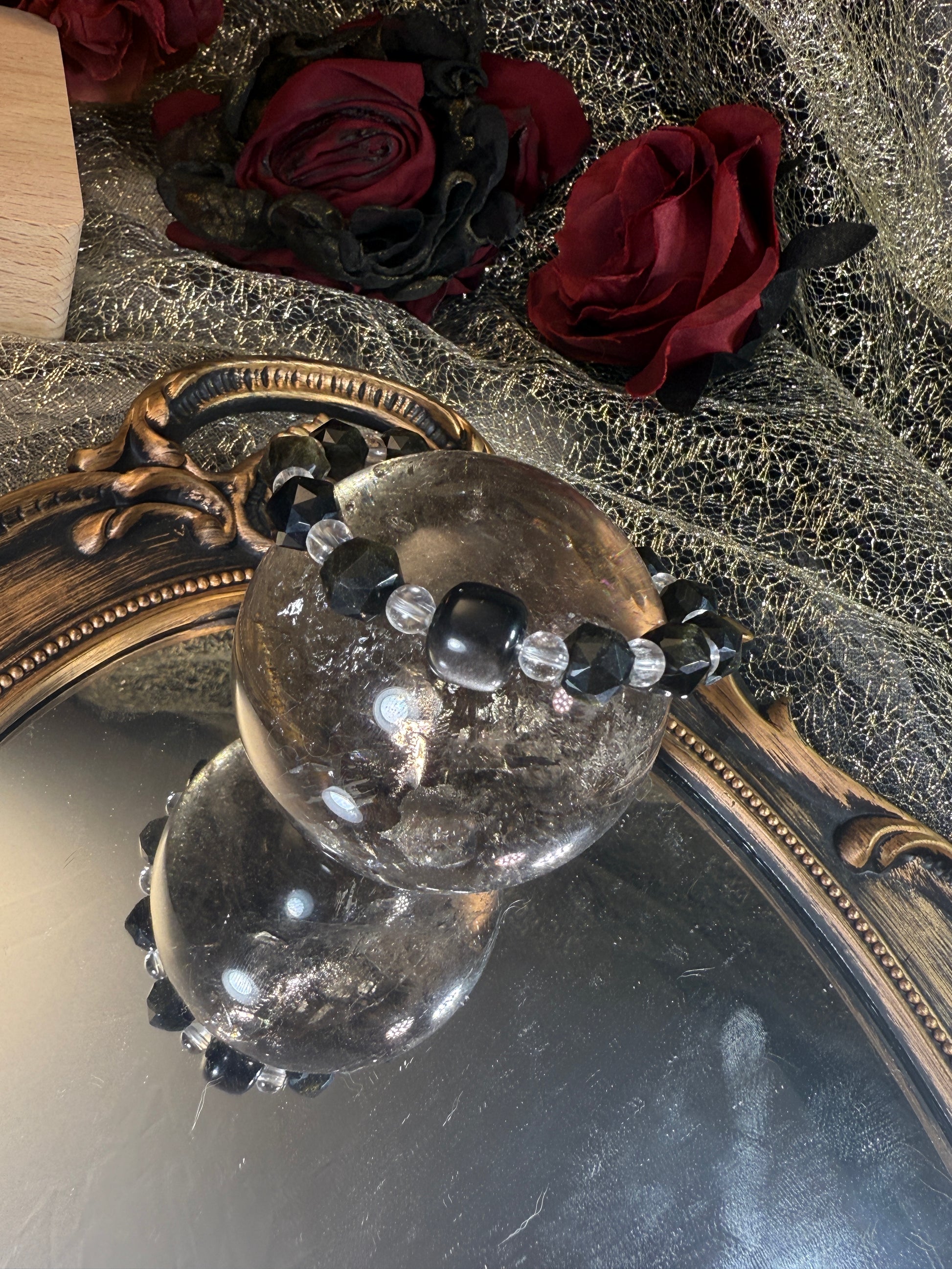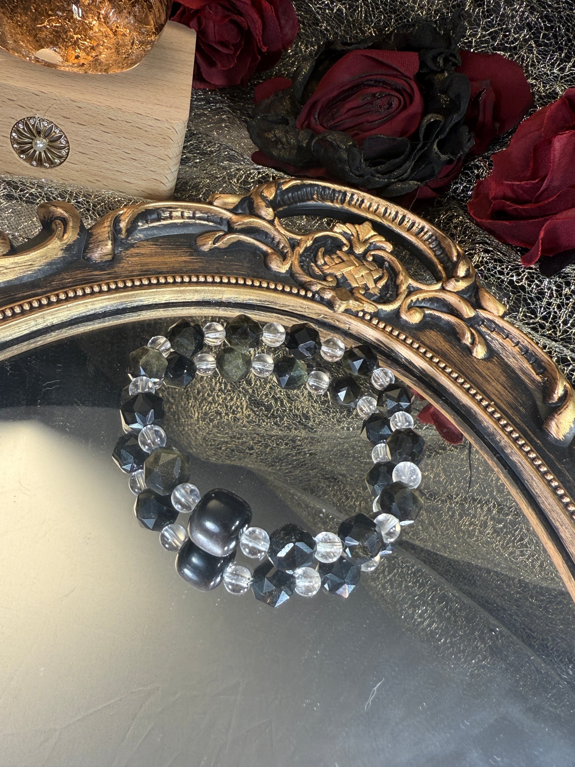 A winding thread of shadow and clarity—Tenebris Coil entwines the grounding force of golden obsidian, the ethereal shimmer of silver obsidian, and the luminous purity of clear quartz. Each facet reflects quiet strength, drawing darkness and light into balance.