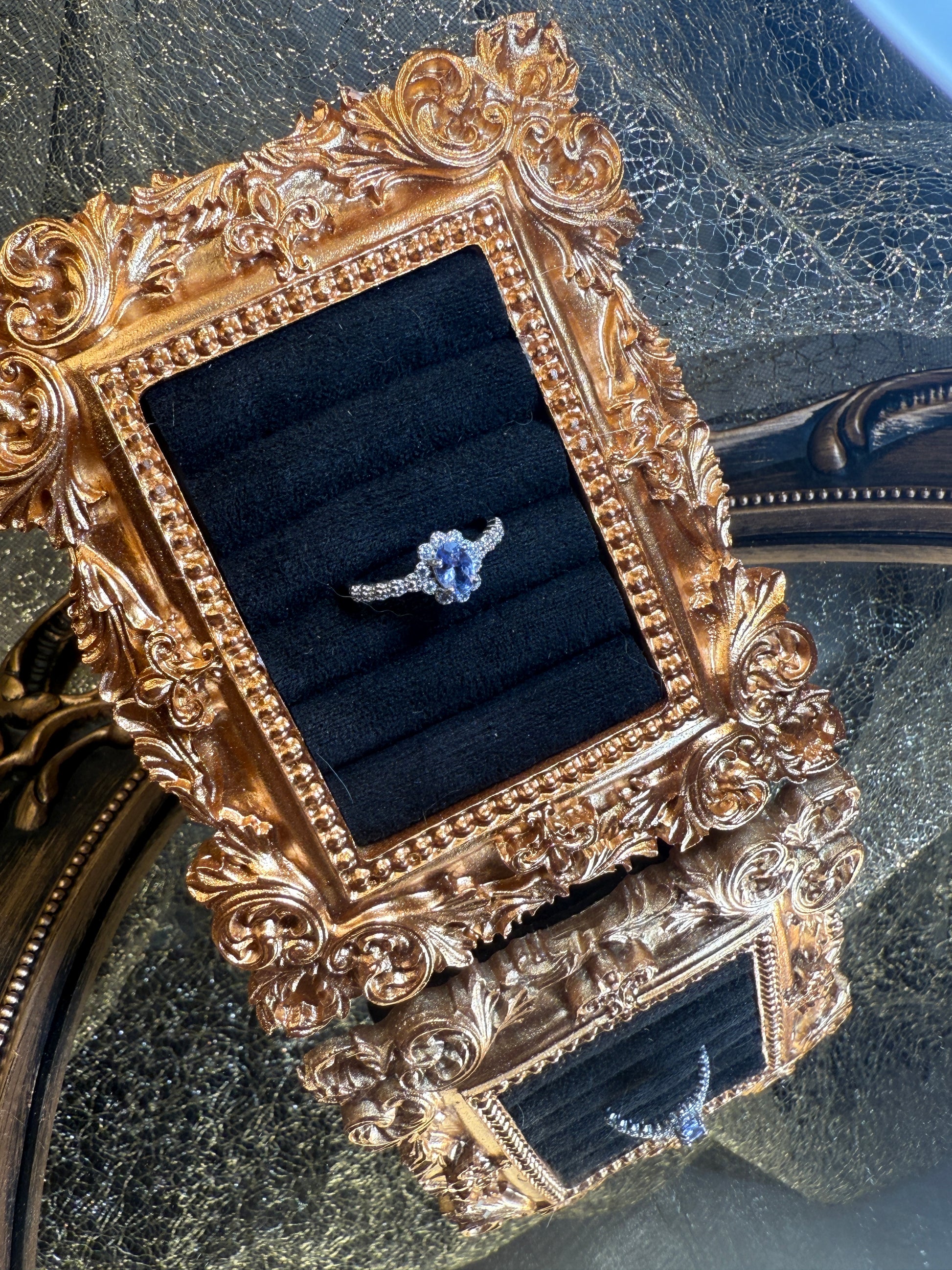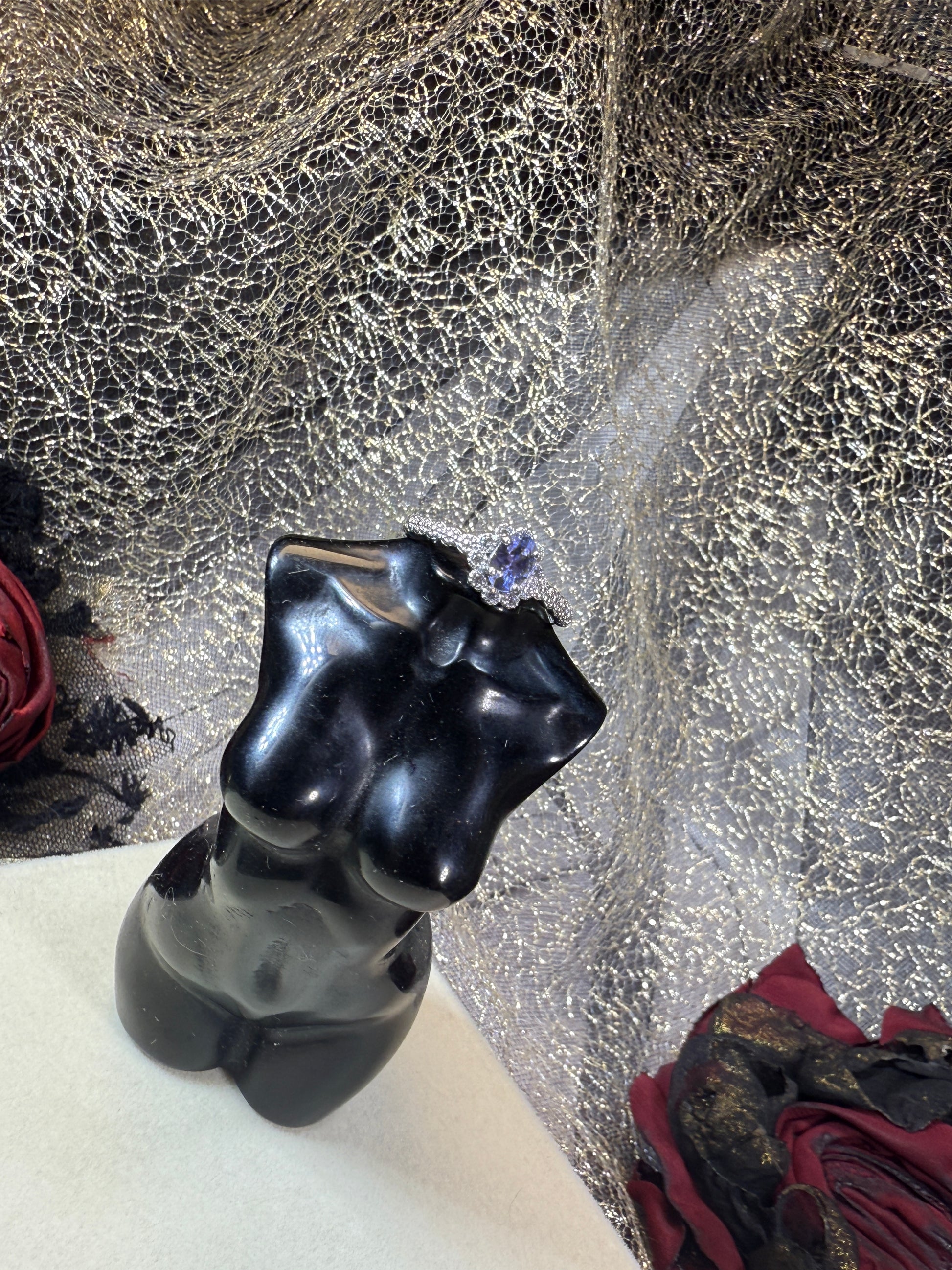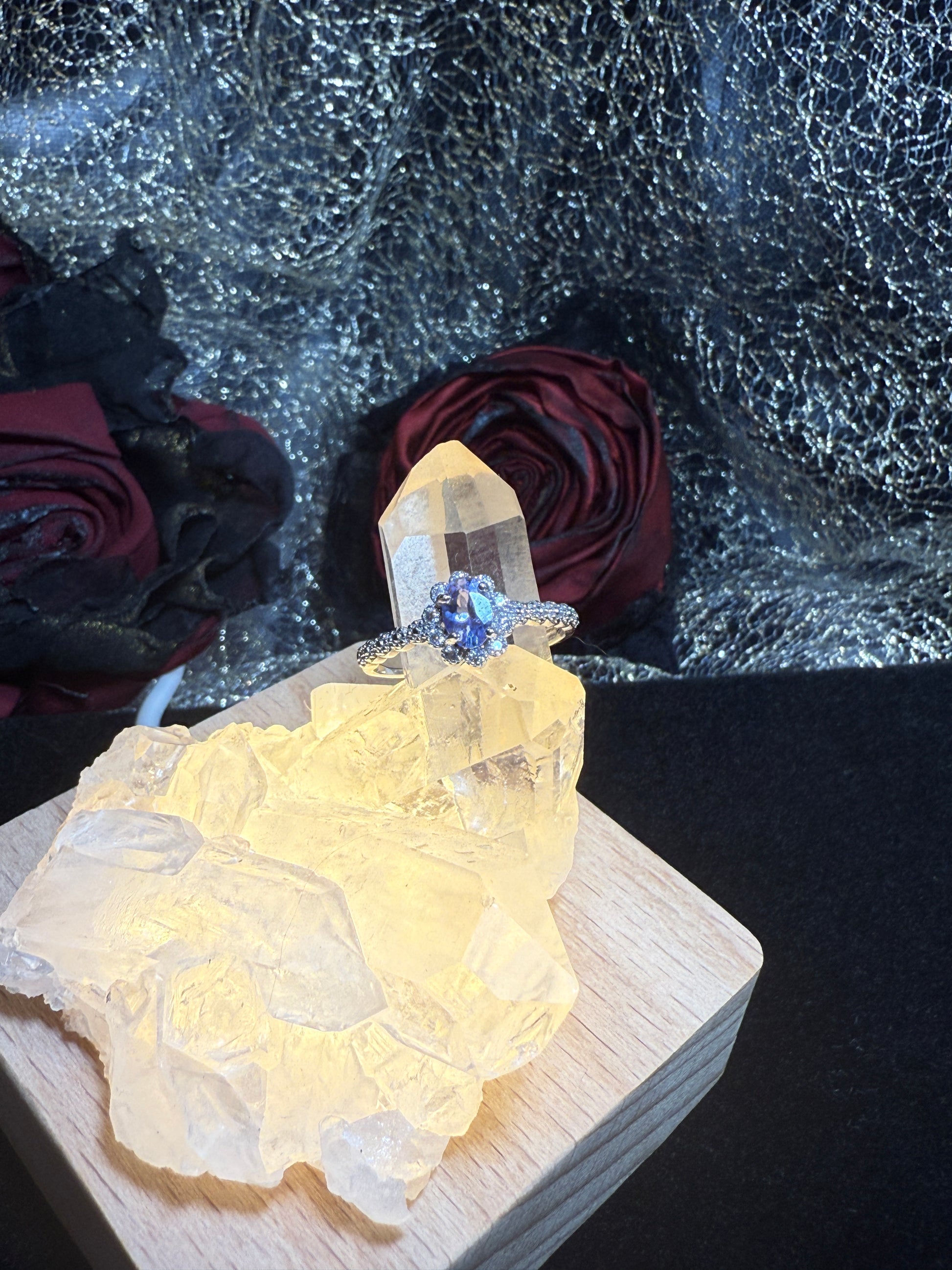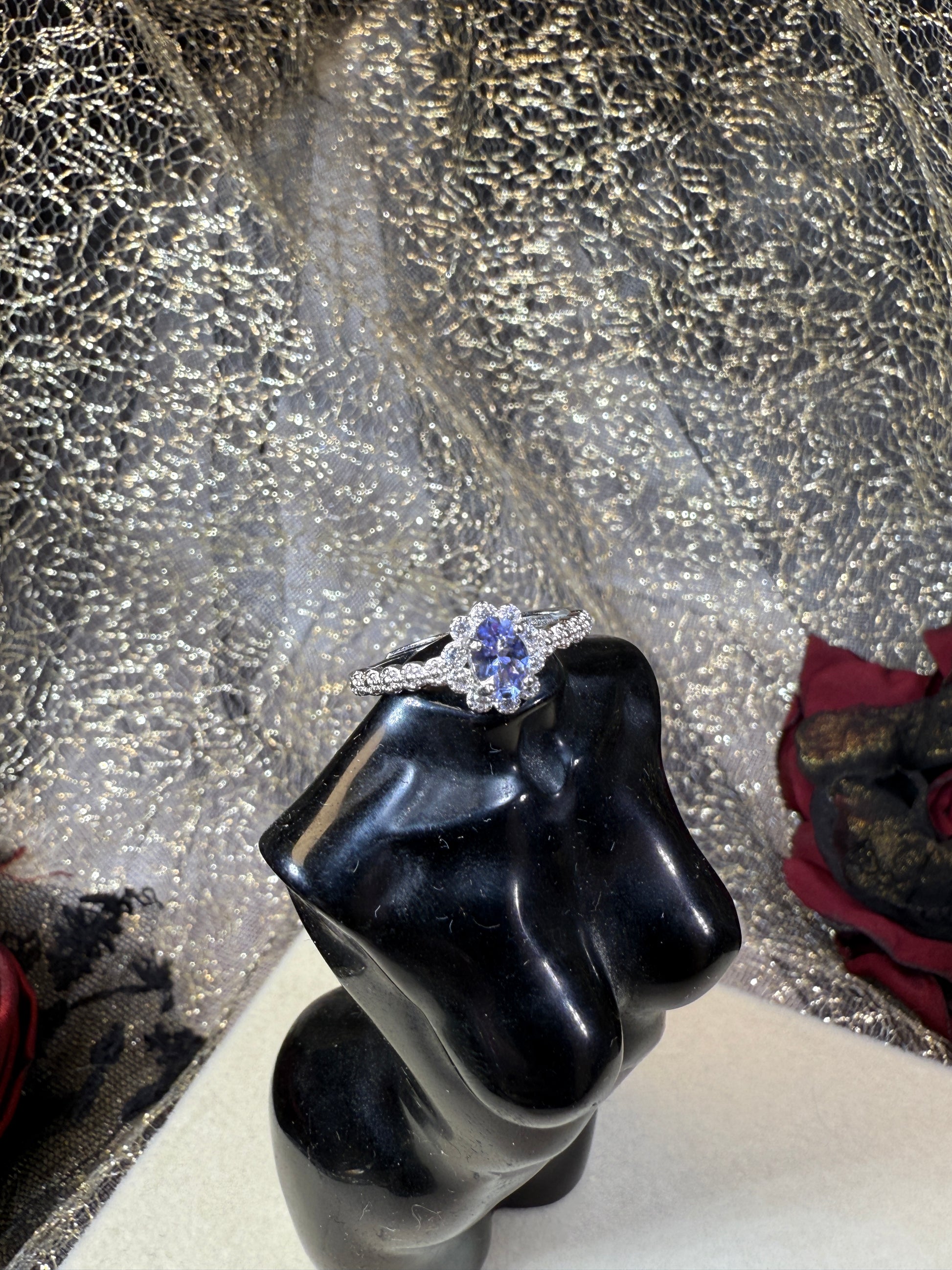 With the soft gleam of dusk, the Twilight Echo ring features a vivid tanzanite encircled by a halo of light and set on a forked silver band. Celebrated for its spiritual clarity and calming aura, this ring whispers of magic, memory, and quiet transformation.