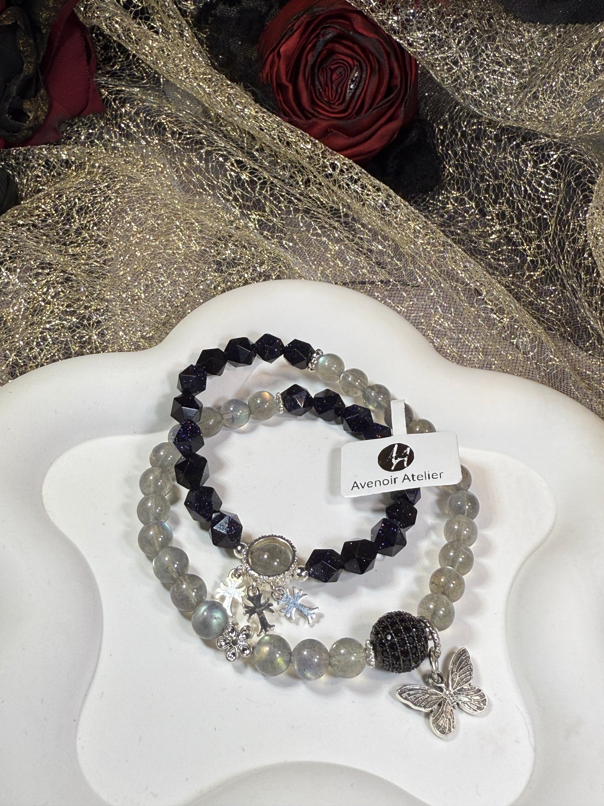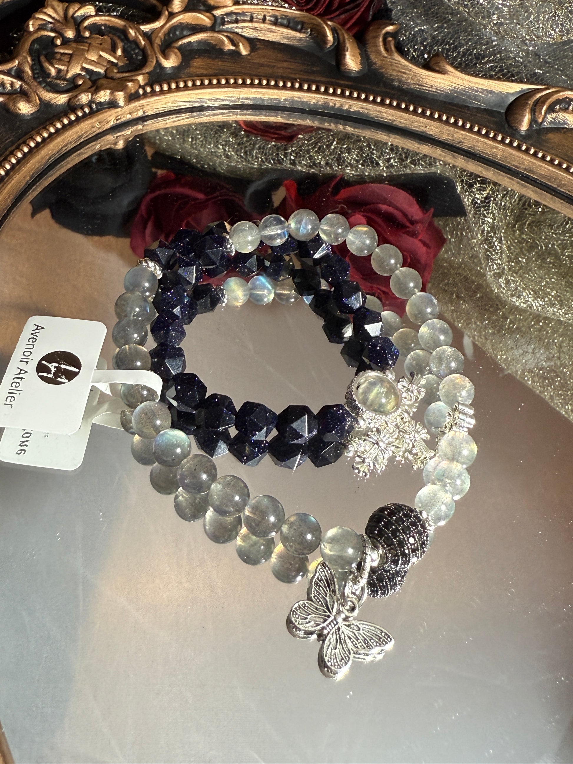 Twilight Waltz pairs soft grey moonstone with faceted black accents and silver charms—like frost, like dusk, like memory dressed in velvet. It doesn’t seek the spotlight. It flickers, quietly.