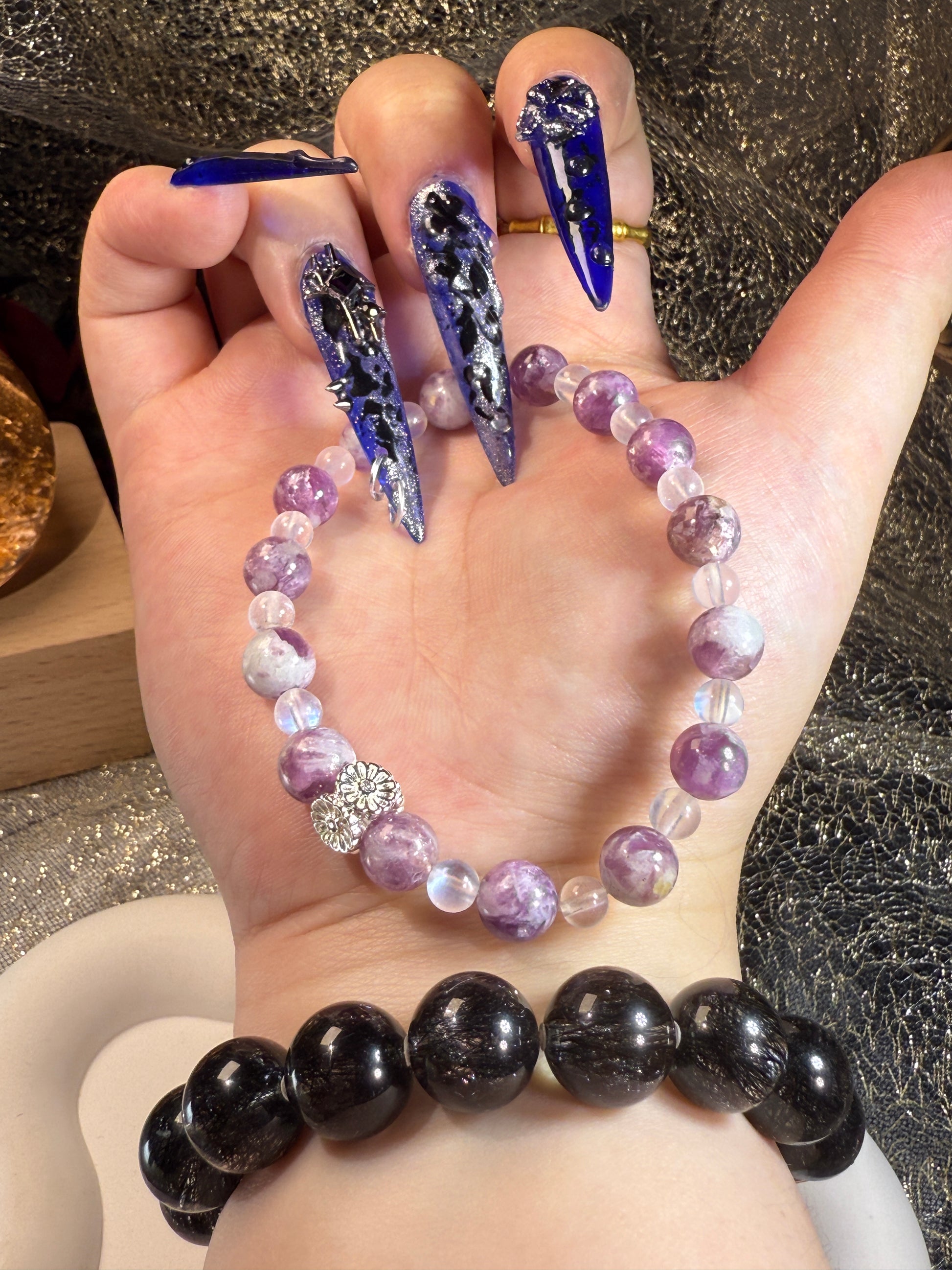 A dance of gentle moonlight upon lavender stone—Violet Moondust captures the serenity of twilight. The soothing lavender hue of lepidolite meets the iridescent glow of blue moonstone, invoking calm, clarity, and quiet strength.