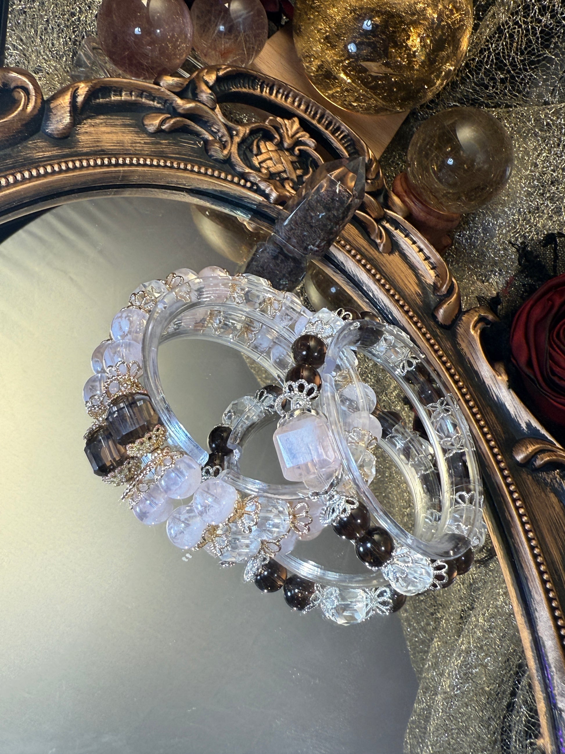 Winter Halo is a talisman of still clarity — crafted with snow phantom quartz, faceted clear quartz, and cube-cut smoky quartz.