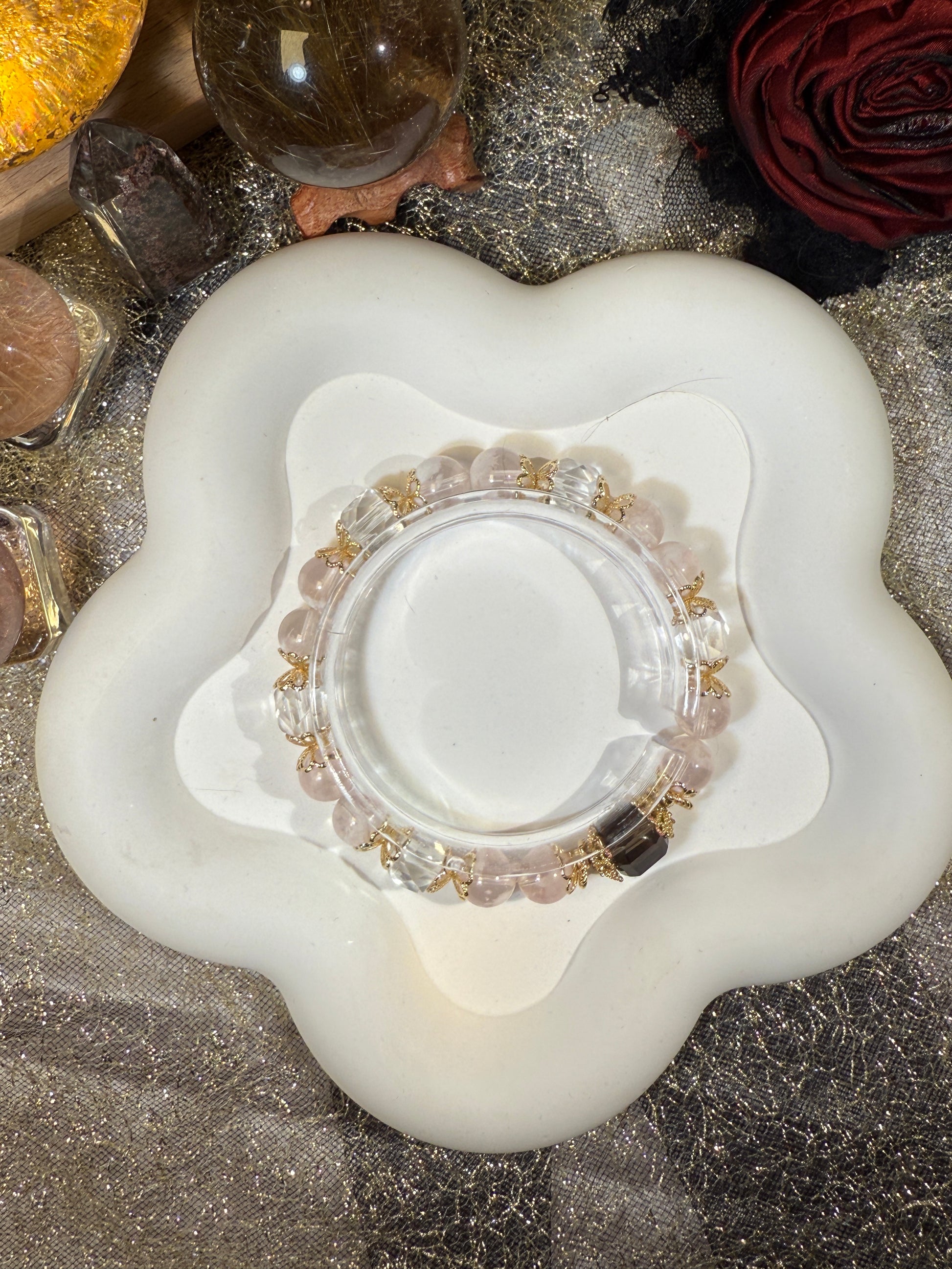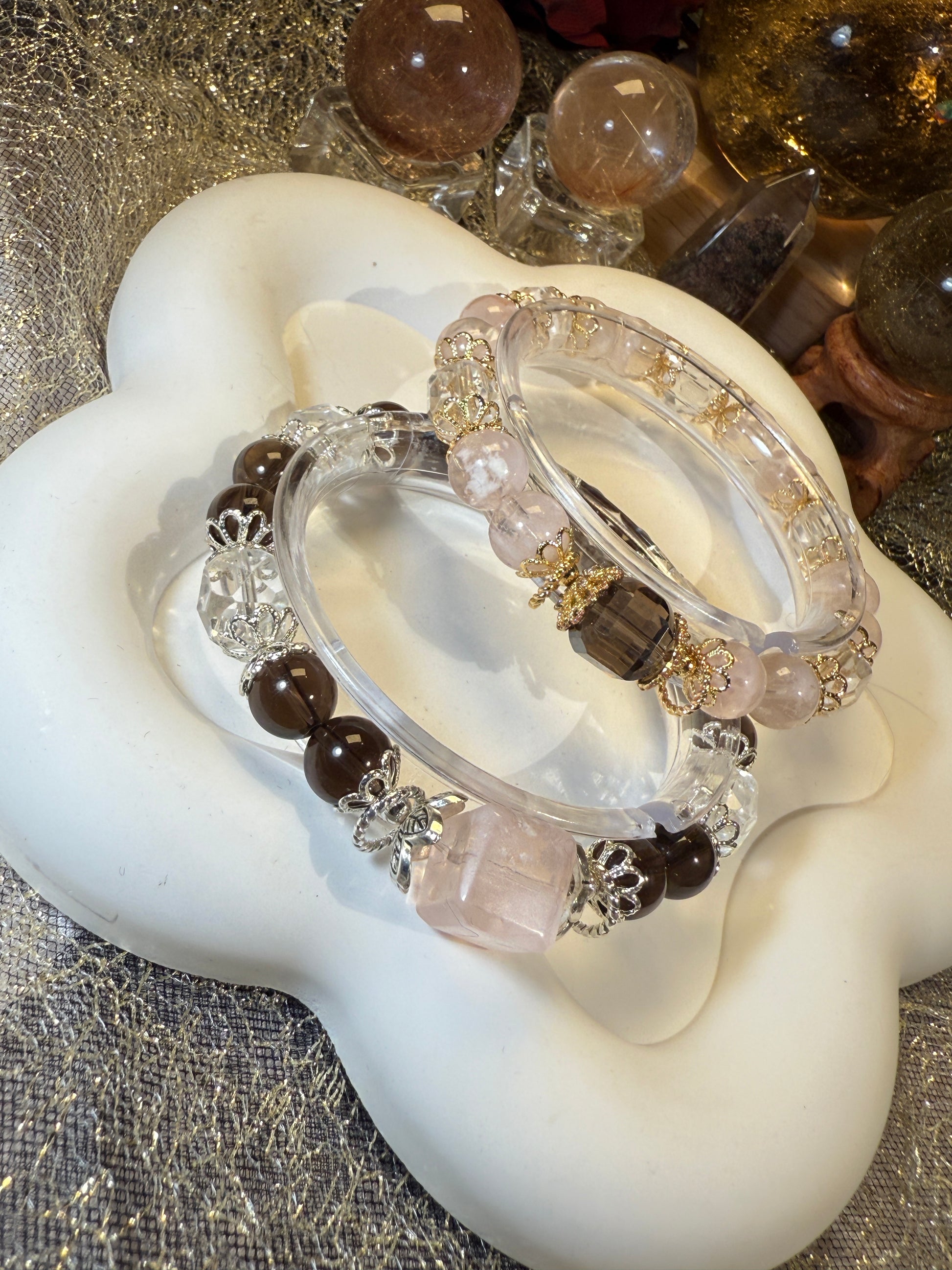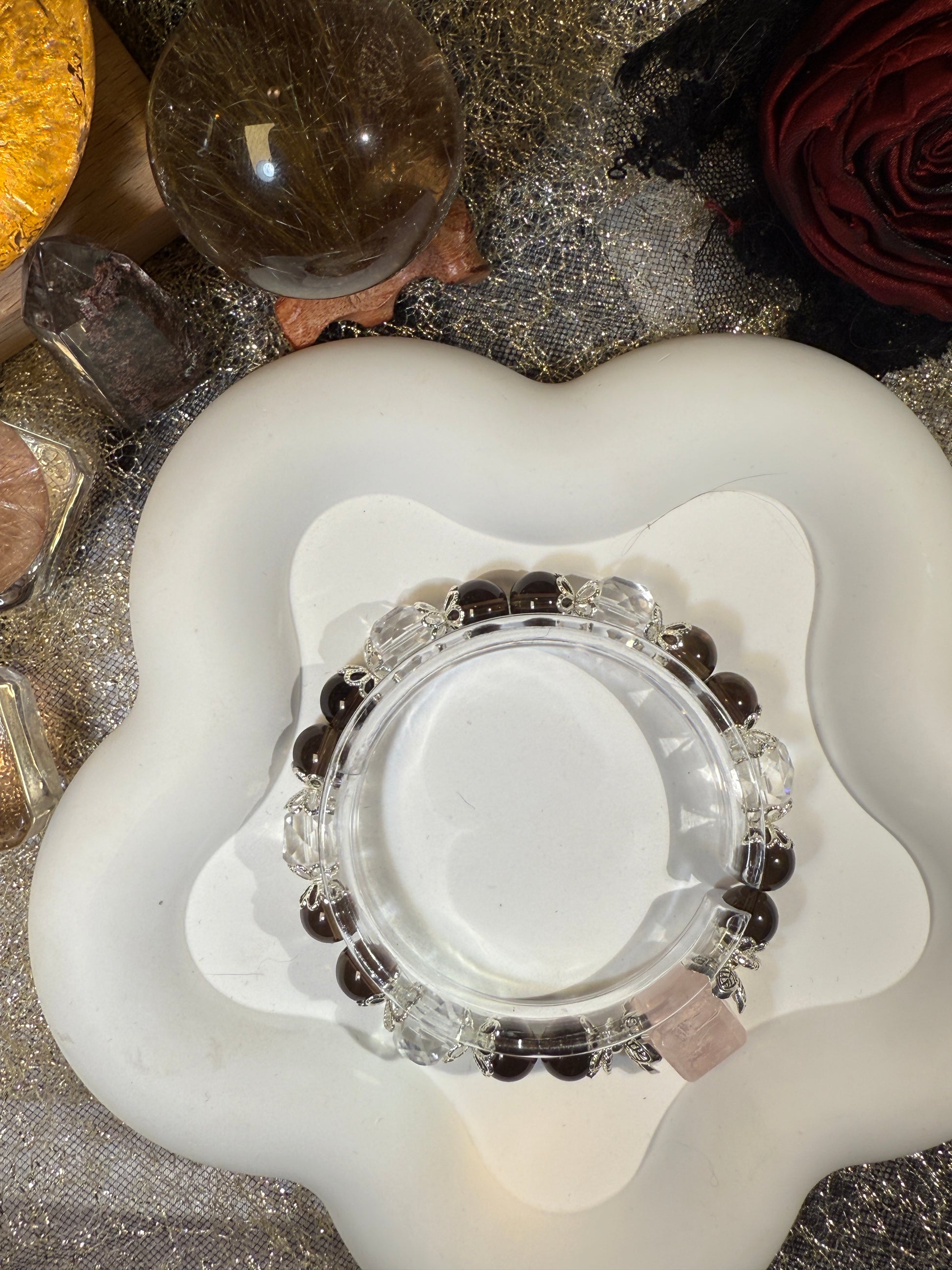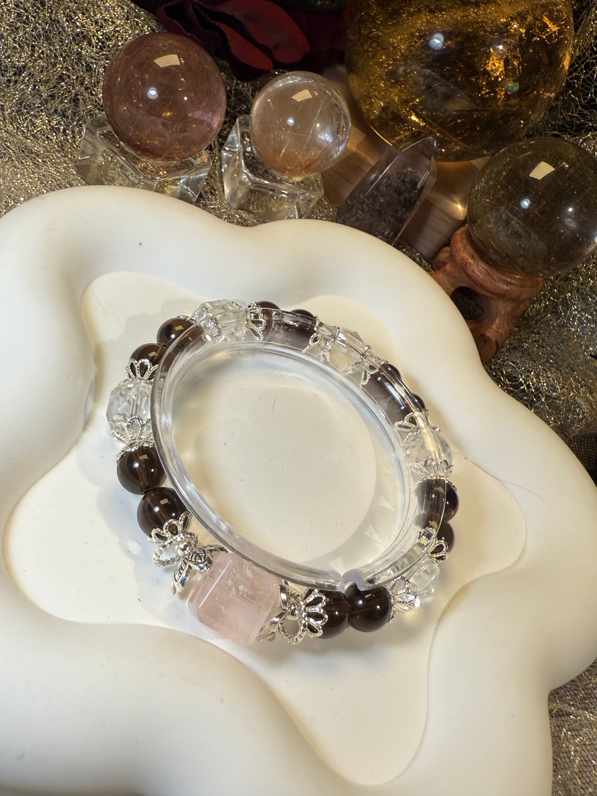 Crafted with faceted clear quartz, smoky quartz spheres, and a phantom sugar cube at the center, this bracelet isn’t made to speak.